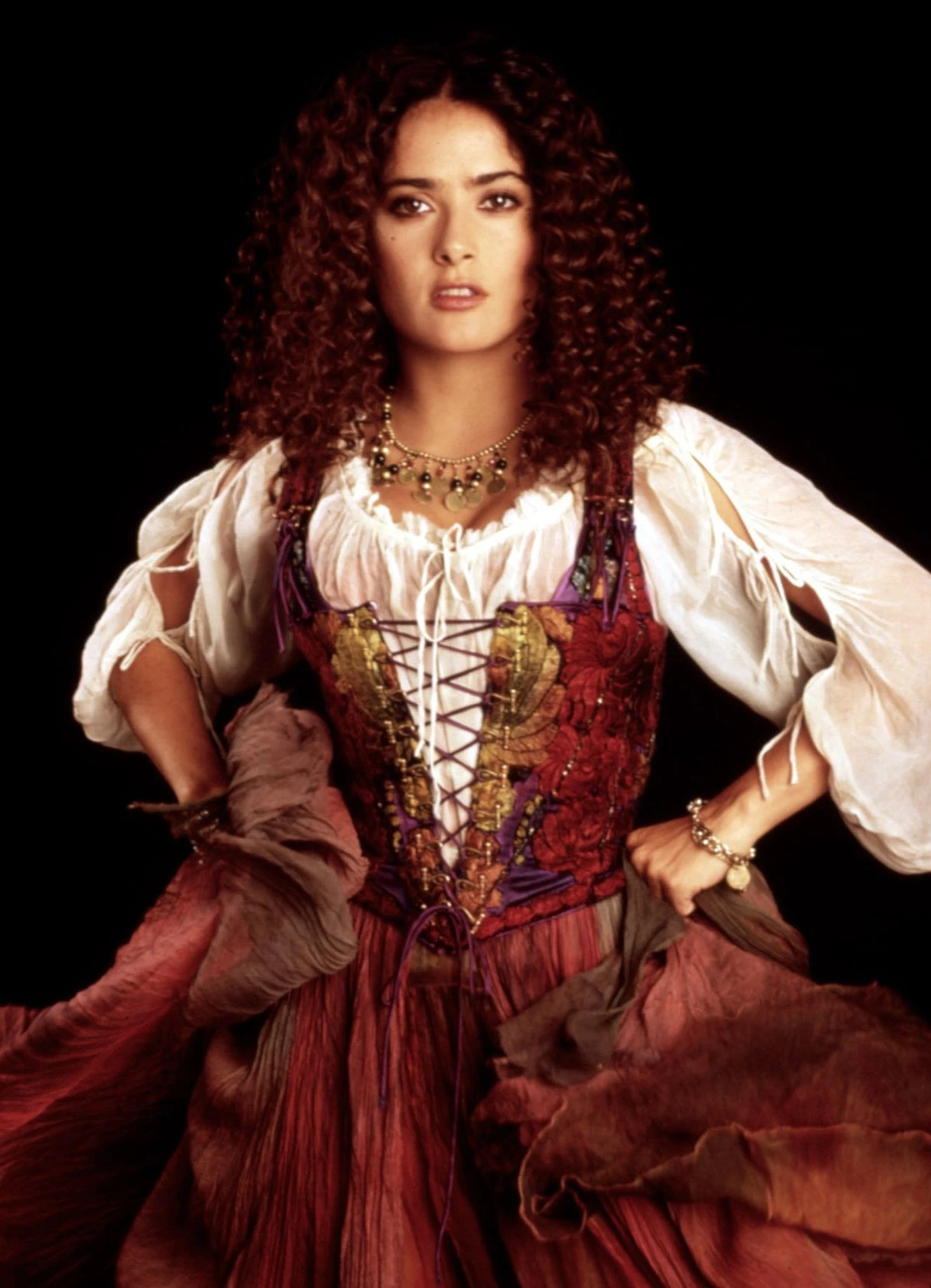 Опять же 30 летняя Сальма изображает юную цыганку, видимо, это все-таки издержки киноиндустрии, нет шансов у юных актрис получить главную роль в масштабном кинопроекте. И перформанс Сальмы на площади больше напоминает восточные танцы, нежели традиционно цыганские. Похоже, в далеком 1997 году в тренде был Восток и все, что с ним связано.