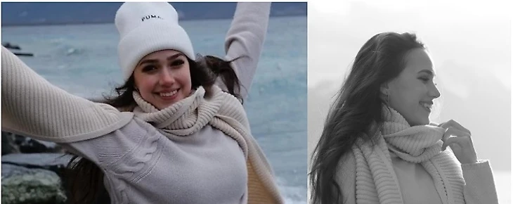 Как писали про первое фото: «Алина предстала с распущенными волосами и сдержанным макияжем и все равно получила массу комплиментов своей естественной красоте». Согласен и отмечу ещё, что на нём она получилась будто вне времени: сделать фото черно-белым, и сойдёт за девушку из любого десятилетия второй половины прошлого века.
