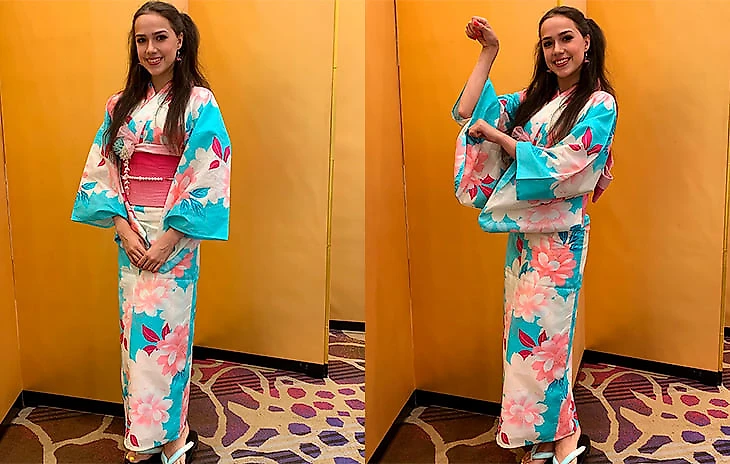 Во время одного из своих визитов в Японию, фигуристка надела юкату - традиционную японскую одежду. Легкое кимоно без подкладки – из конопли, льна или хлопка, с прямыми швами и широкими рукавами. Эти кимоно условно делят на повседневные неброские и праздничные (именно такой вариант на фото). В комплект также входят сандалии гэта (обязательно на голую ногу).