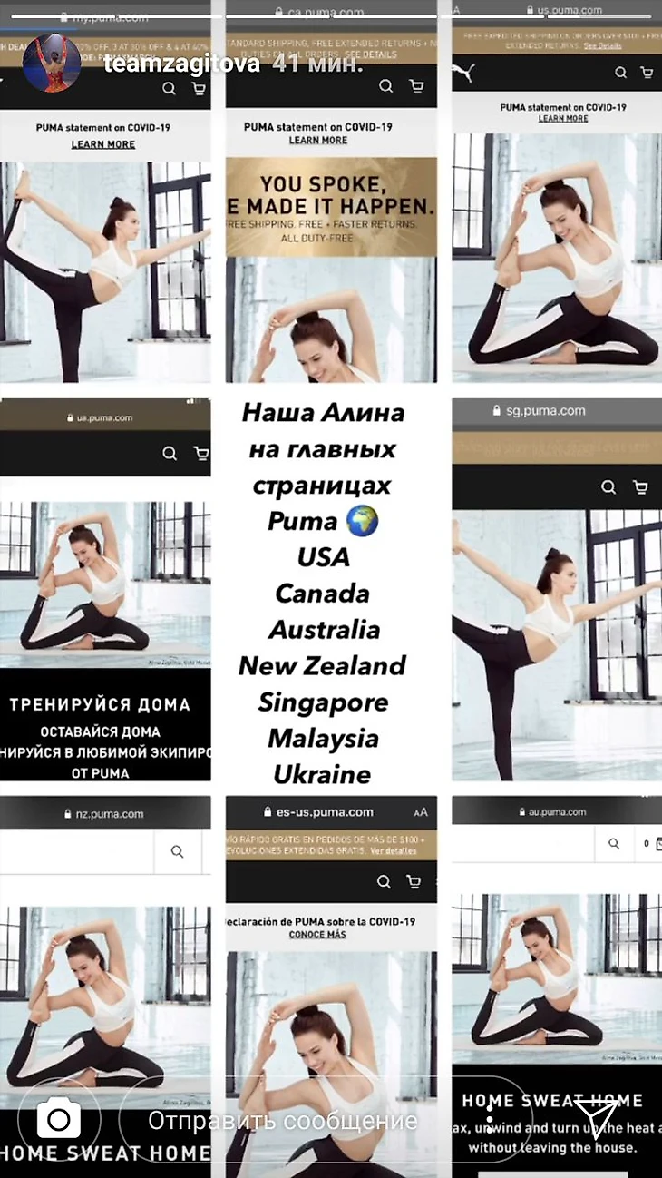 Фотография Алины Загитовой в Студио коллекции Puma помимо России размещена на официальном сайте компании в различных странах Европы (Германии, Великобритании, Франции, Чехии и тд), Юго-восточной Азии, Турции, Австралии, Новой Зеландии, США и Канады.
