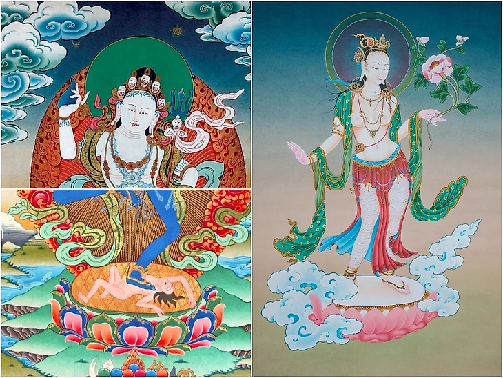 Дакини-Ксюша скорее из тибетской темы. Там они носительницы женского начала, задвигают за Пробуждение духа и всякое такое. Но всё равно носили ожерелья из человеческих костей, хорошо, что на Ксюше их нет. Напротив, на спине у неё лотос --- один из главных символов чистоты и непорочности в буддизме. Считалось, что лотос хоть и рождается в болоте, но он божественно красив и незапятнан. Ксюшино платье потрясающего цвета очень в эту историю вписывается.