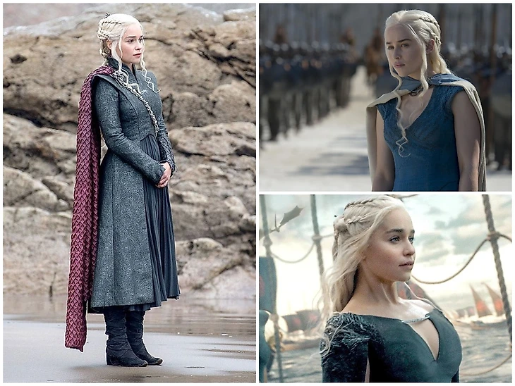 Самое первое платье Саши к ПП мне сначала не зашло. Возможно это потому, что я не подозревала, что будет дальше. Но потом присмотрелась. Это не копия одного из платьев Дейенерис Таргариен, а скорее вольная фантазия на тему от Ольги Рябенко.