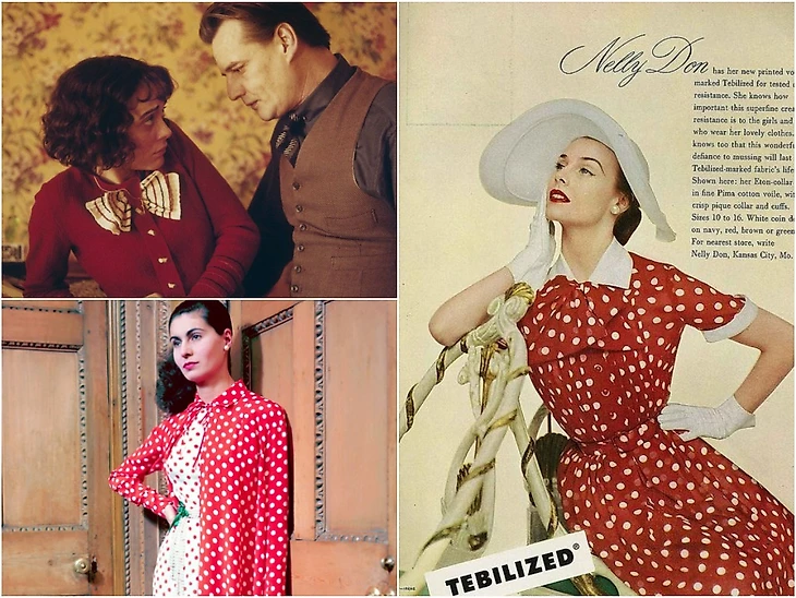 «La vie en rose» была написана в сороковых годах, впервые исполнена Эдит в 1946-м. Горох тогда был популярен, как и тонкие талии, затянутые поясками. Самый расцвет женственности ещё впереди (1950-е с их пышными юбками), но уже тогда дамы начинают потихоньку привыкать к мирному времени и вспоминать, что они снова могут быть просто красивыми женщинами. (Первый кадр - из «Жизни в розовом цвете» с Марион Котийяр. Эти бантики стали прекрасной отсылкой).