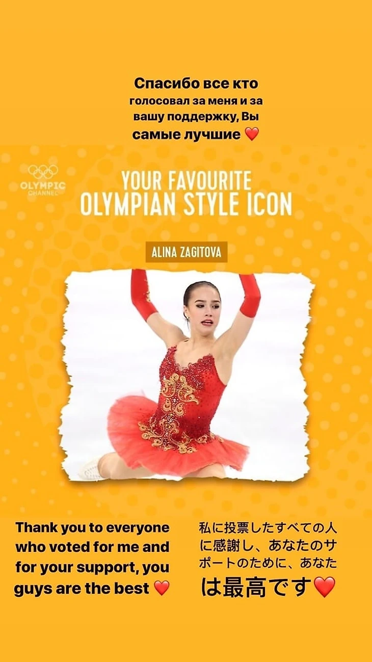 "Российская фигуристка Алина Загитова стала Иконой Олимпийского стиля, выиграв голосование, организованное @olympicchannel. Поздравляем Алину - блестящую спортсменку и очаровательную юную леди!"