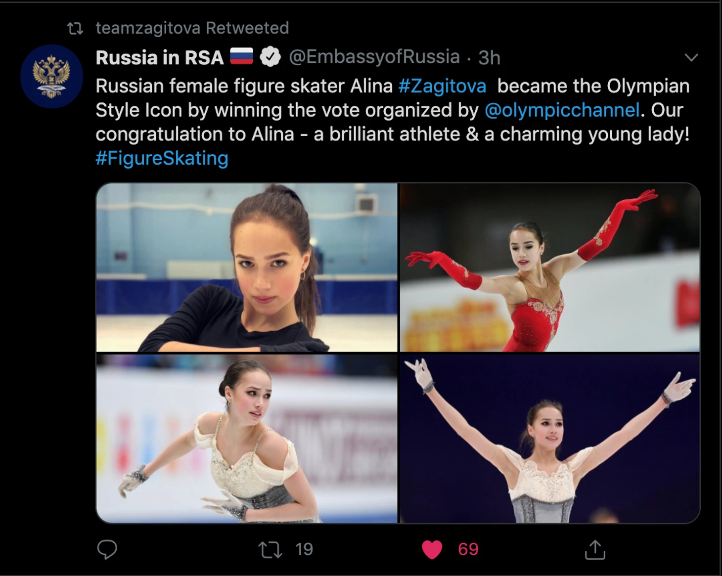 Это событие не оставили без внимания МИД РФ, и посольство России в ЮАР разместило пост - поздравление Алине Загитовой в своем твиттер аккаунте: