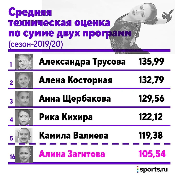 Средняя техническая оценка Загитовой по сумме двух программ не попала даже в топ-15 в мире. Отставание от лидера – Александры Трусовой – 30 баллов. А средняя базовая стоимость элементов болтается на 14-м месте; тройка лидеров впереди на 15 баллов. И пусть компоненты у Алины – вторые в мире, этого недостаточно, чтобы компенсировать отставание в технике даже с учетом форы над Трусовой и Щербаковой в виде запрета на квады в короткой. И здесь невольно задаешься вопросом: если Загитова все это знает, то зачем?
