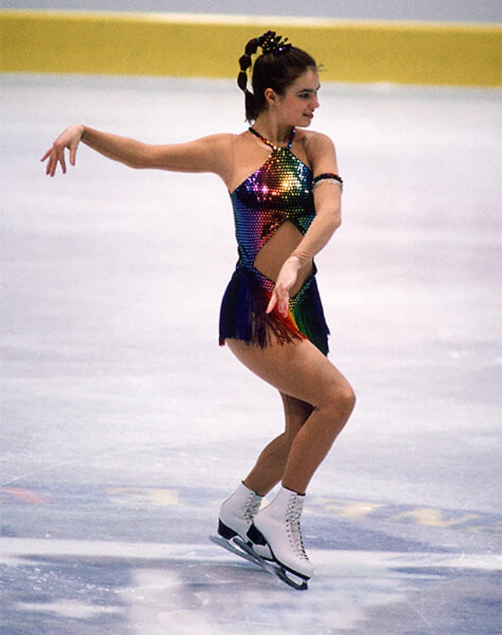 После произвольной немке досталось за эталонную Кармен. Вопросов к длине (и вообще наличию) юбки не возникло – на этот раз судьи замеряли глубину декольте, пусть и приглушенного сеткой. Сейчас это привычный прием: спрятать вырез под сеткой или даже собрать весь костюм из сетки в сочетании с плотной тканью. Но 1980-е лайкра и материалы на ее основе только попали в обиход – публика просто не привыкла к таким декольте.
