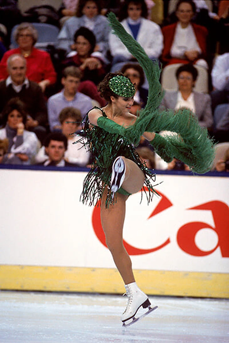Вообще, все наряды Витт в Калгари-88 – легендарные. Судьи кипели еще до короткой программы: это не платье, а купальник с перьями.