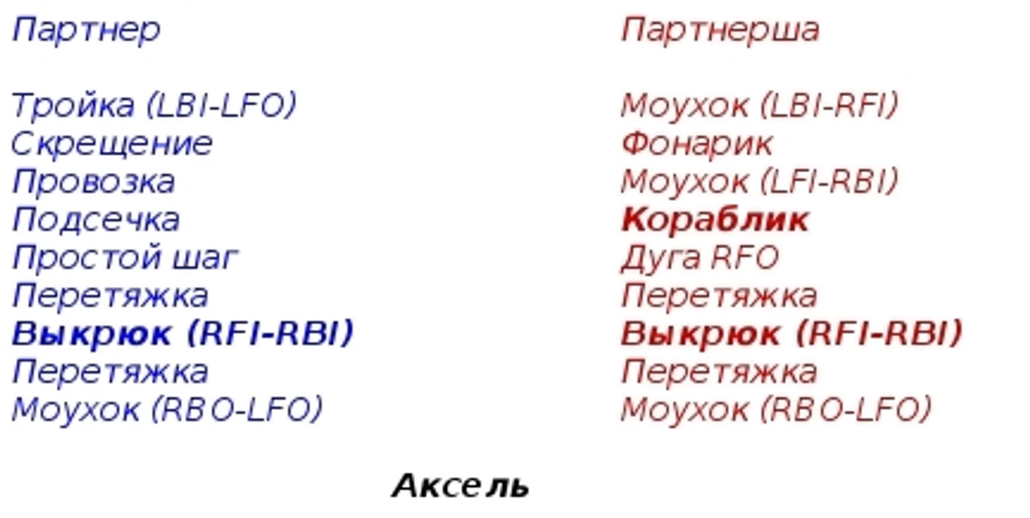 Заход: широкий шаг - подсечка - разворот - дуга LFO - скрещение - крюк (RFI-RBI) - перетяжка - моухок (RBO-LFO) - аксель