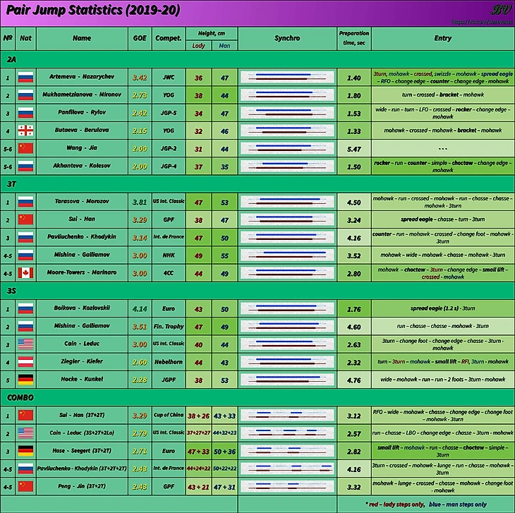 В этом выпуске у нас четыре рейтинга, три по сольным прыжкам 2А, 3Т, 3S и четвертый по лучшему каскаду. Как и прежде, пары ранжируются по величине GOE (по шкале -5 ... +5) на лучшей попытке. Начнем с самого простого из прыжков.