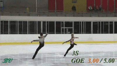 Заход на прыжок очень сложный, аж 3 разных сложных шага исполняются на относительно коротком участке и дополнительно сопрождаются сменой направления перетяжкой, по юниорским меркам это очень приличный заход. Даже по меркам одиночников это был бы очень приличный заход. Так как ребята прыгают примерно на одну высоту сказать как именно они синхронизируются сложно, но здесь почти совпали. Ксения оторвалась и приземлилась примерно на полтора-два кадра раньше, но на некоторых других стартах опережал партнер. Кстати, по ходу сезона выезд с прыжка несколько раз менялся.