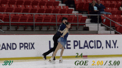 Дистанция между партнерами 3 - 4.5 метра. Это определенно самый сложный из всех представленных в ТОП-5 каскадов, но сортируем мы, напомню, по величине относительных GOE. В самом начале заметен небольшой рассинхрон, как обычно, первым в отрыв уходит партнер, но при этом на середине пути партнерша его догоняет, а затем перегоняет, а ближе к концу вновь немного отстает. Но для каскада из трех прыжков, тем более с сальховом, тем более с риттом, это весьма приличное исполнение. Тут просто не с кем больше сравнивать. В одиночном женском, конечно, они бы по отдельности и в ТОП-20 не попали, а в одиночном мужском вообще такого рейтинга не было бы, но это, напомним, одиночное парное. При этом, с некоторой вероятностью, у Эшли 3Sq на 3S. Но, в любом случае, это самый сложный каскад из представленных.