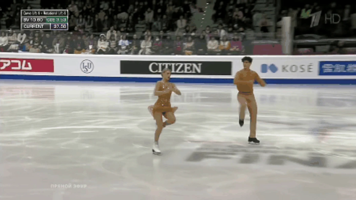 И да, французы вновь не первые! Надо признать, что французы могут похвастаться стабильными грибами похвалами судейской бригады, но стабильным идеальным исполнением - нет. Но любимчиков, не побоюсь этого слова, принято тянуть, хотя конкретно в финале гран-при они показали образцовое исполнение серии твизлов.