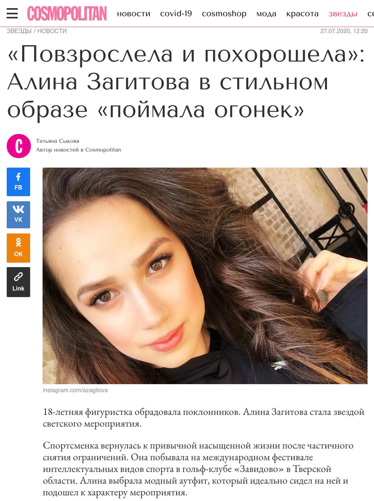 Участие Алины Загитовой в фестивале также осветил модный журнал Cosmopolitan, отметив на своем сайте и безупречный внешний вид Алины, и ее успехи в освоении гольфа.