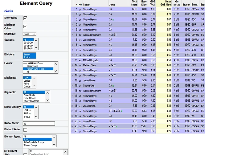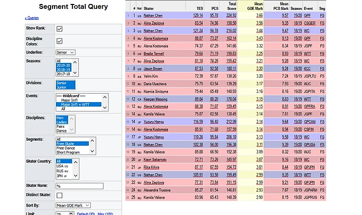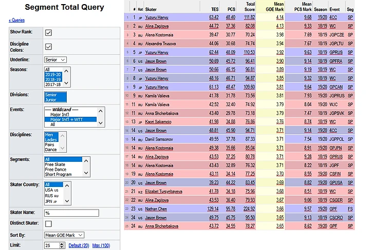 Сайт SkatingScores представил инструмент для обработки информации их базы данных. Можно искать элементы по критериям, формировать рейтинги и просто работать с собранной на сайте информацией.