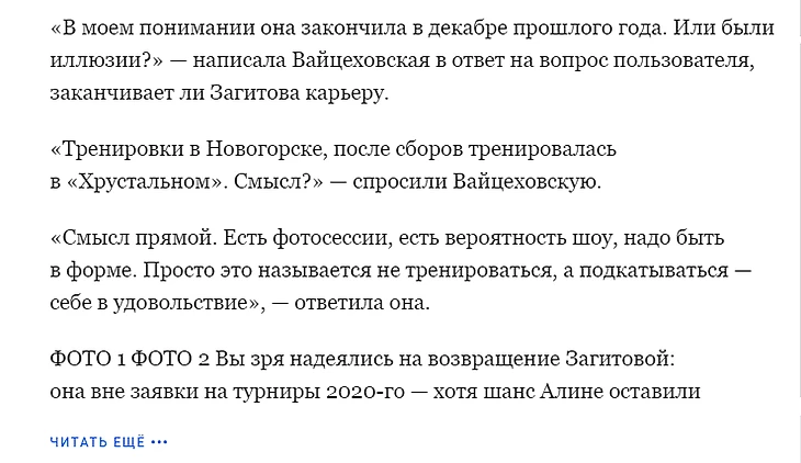 Аналитик же этого блога сказал для себя о конце карьеры Загитовой буквально в ту секунду, когда она, испуганная, увидала на табло, что оказалась чемпионкой у Баха на именинах: «Всё. Ее лишили главной цели жизни в 15 лет», – так я себе сказал.