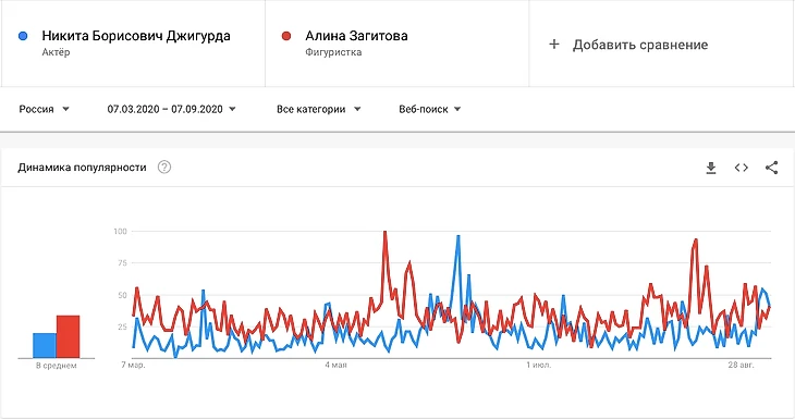 Чистая победа прославленной фигуристки! Бывший муж Марины Анисиной уступил Загитовой по популярности в полтора раза, хотя пиковые значения у них практически одинаковы. Вполне вероятно, что кипучая активность Никиты Борисовича в медийном пространстве в связи с делом Михаила Ефремова позволит ему приблизиться к показателям Алины в самое ближайшее время.