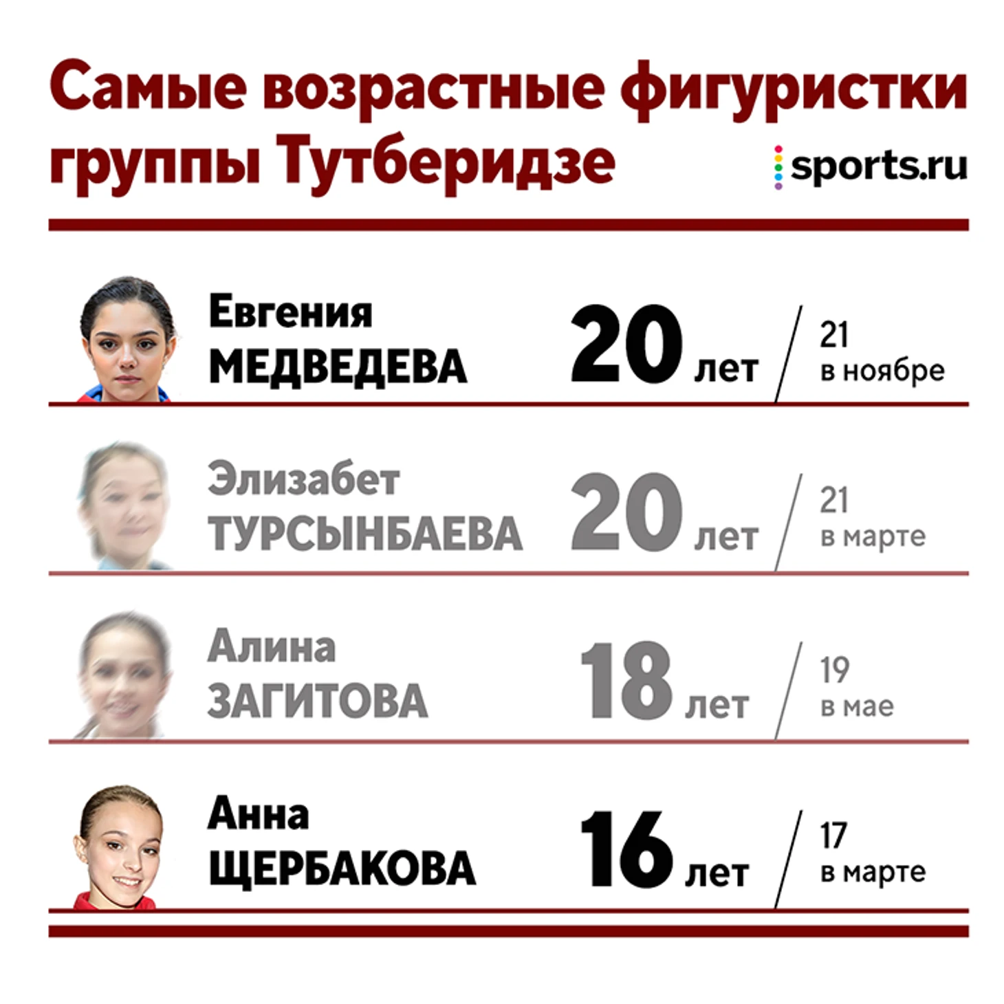 • Анне Щербаковой – 16, она соревнуется: кажется, это идеальный возраст для системы Тутберидзе. И все, дальше только юниоры, для которых Медведева – абсолютный ветеран.