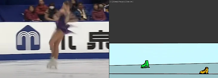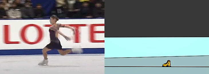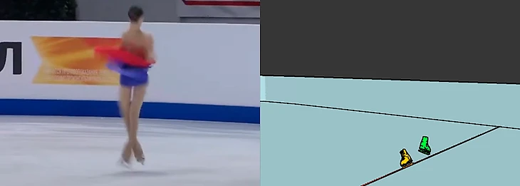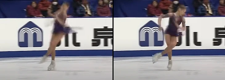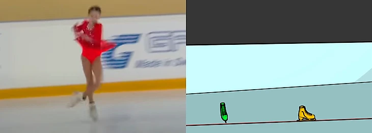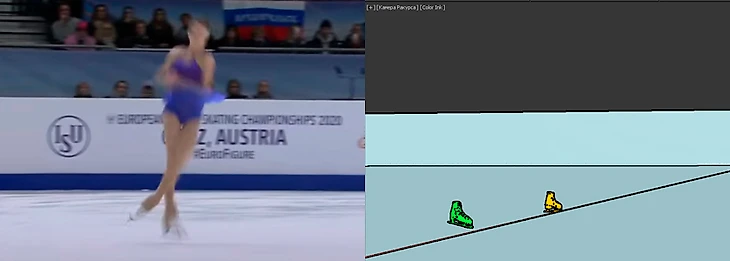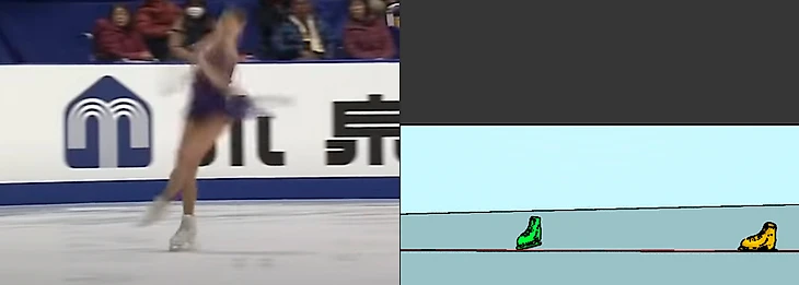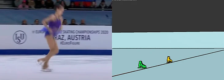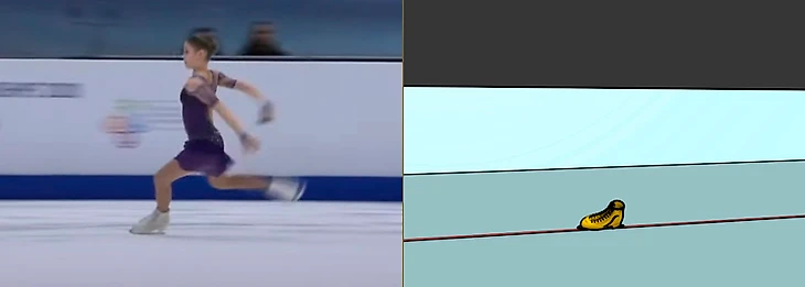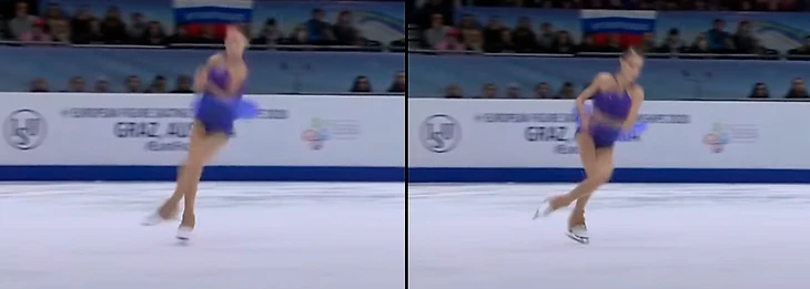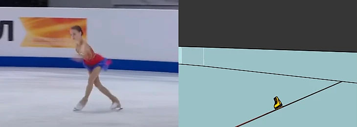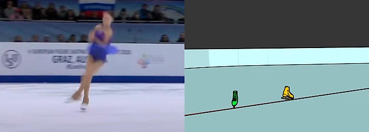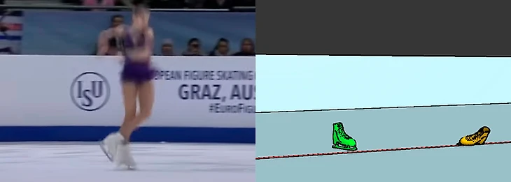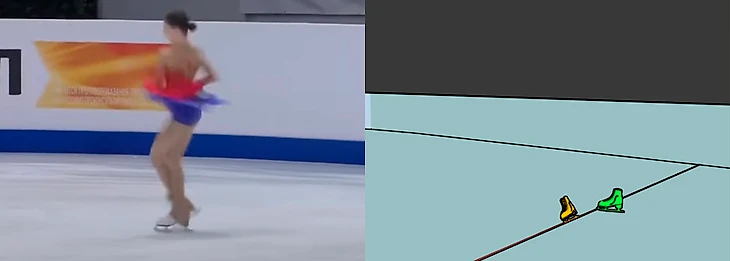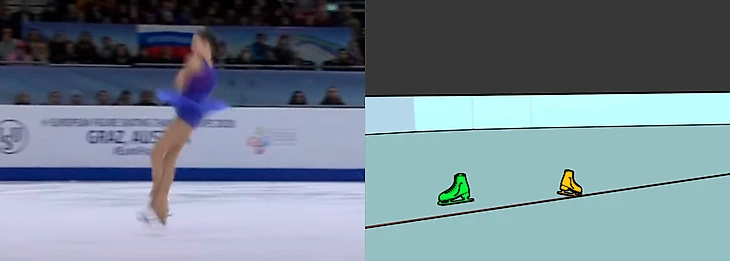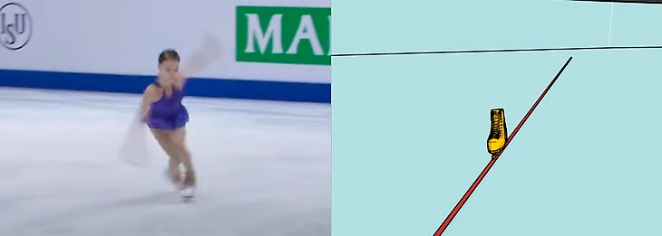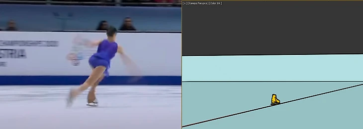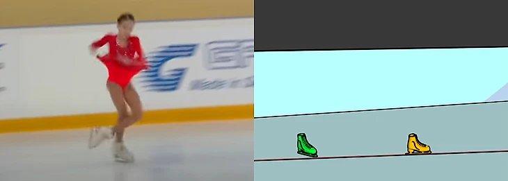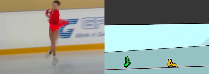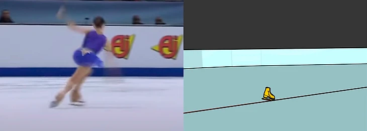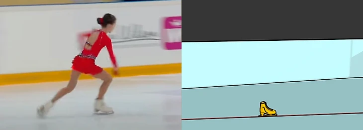 Заднюю часть конька не видно, ясно только, что она правее передней. Но следующий кадр показывает небольшой наклон и небольшой угол, который отличает кадры: