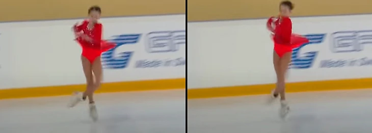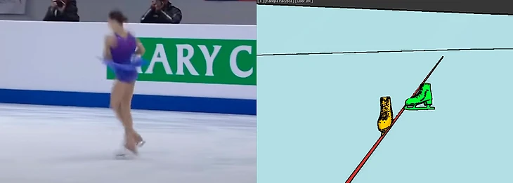Таким образом становится видно, что недокрут большой, но на пол-оборота не похоже вообще. Опять же, на неточность модели не списать - это снова судейская ошибка. Опять не в пользу фигуристки. И хотя эта принесла меньше потерь, чем на 4Ф, всё же здесь должна была быть одна "галка", а никак не "две".
