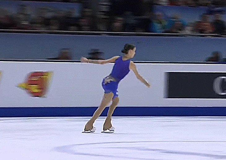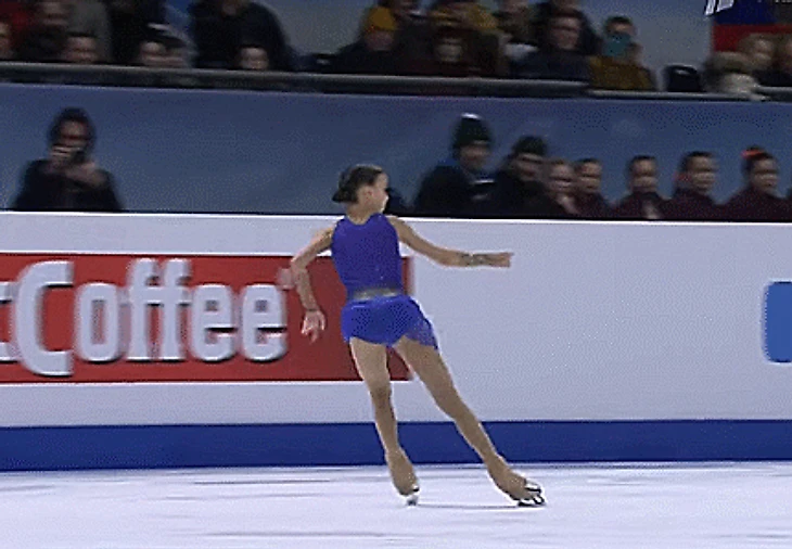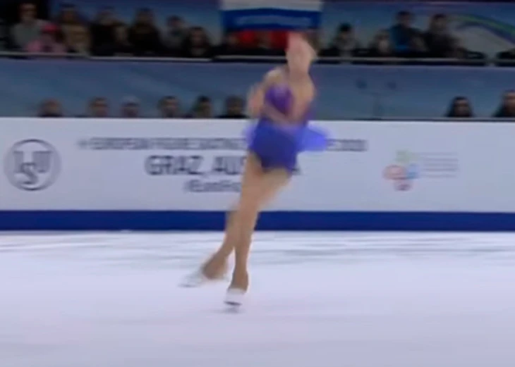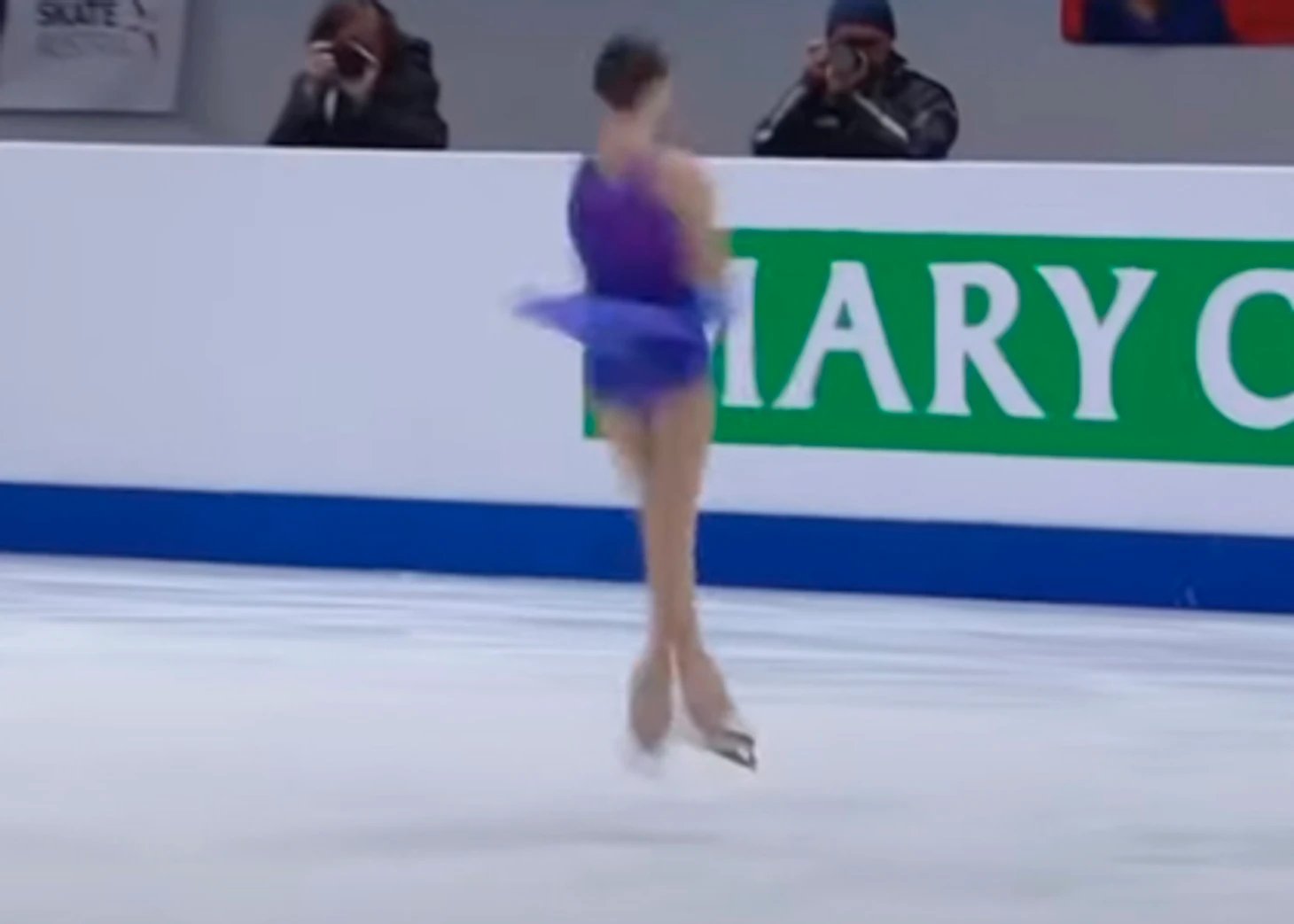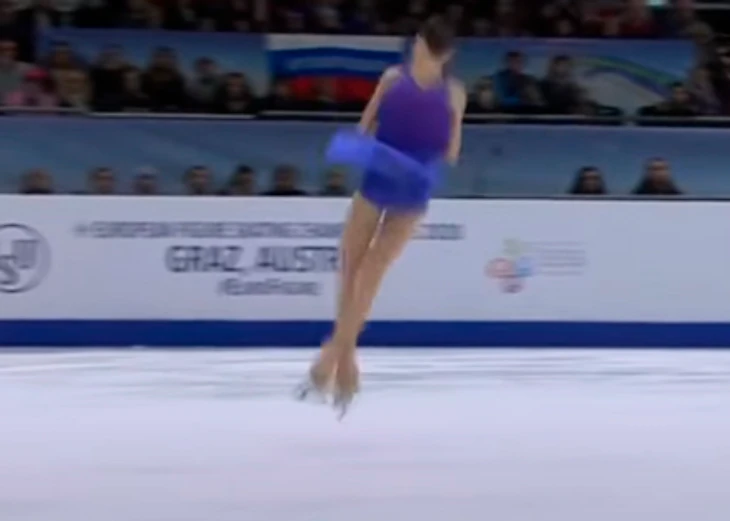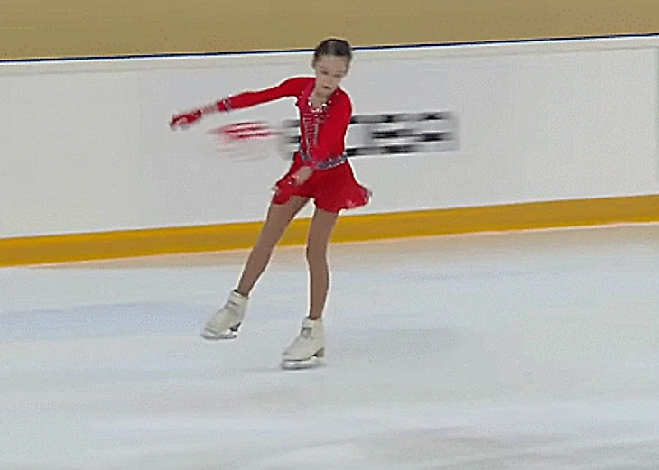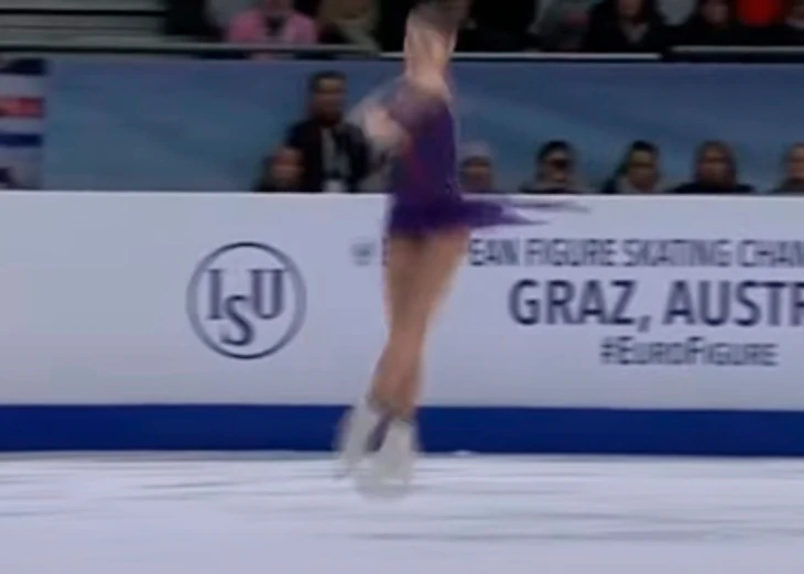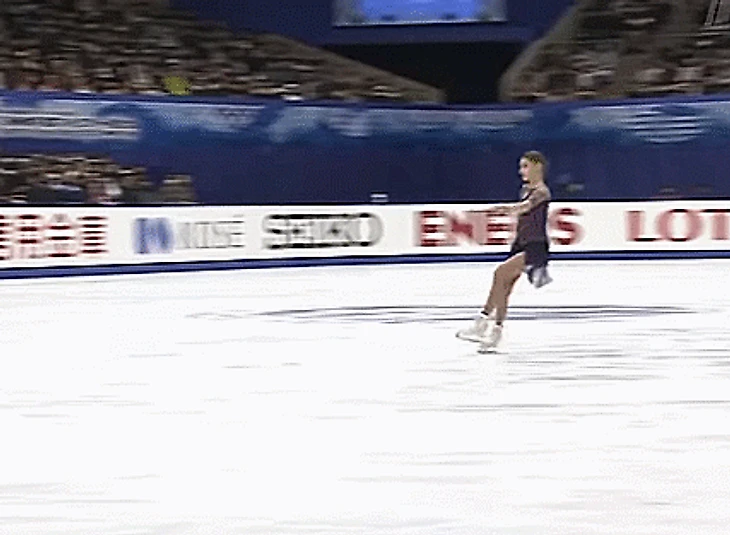 За один кадр до приземления Алёна едва касается кончиком конька льда - и на этот раз, кажется, носок и пятка конька равноудалены от камеры: