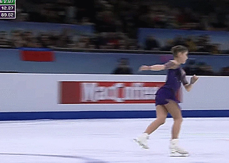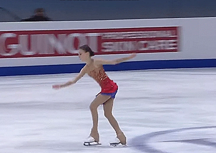 В итоге получается недокрут, настолько далёкий от 90, что я заявляю о судейской ошибке. Как и в случае с 3А Алёны в КП во Франции, "галка" была поставлена неверно. Возможно, судью смутил крутой поворот Ани на выезде, а на начало прыжка он не обратил внимания... В этом отношении ситуация схожа с каскадным 3А Алёны на ЧЕ, хотя решение было принято иное.