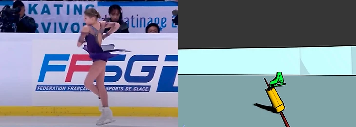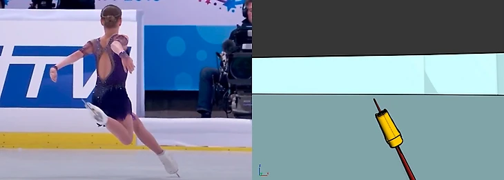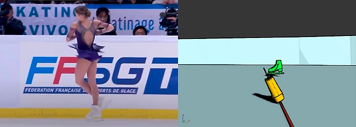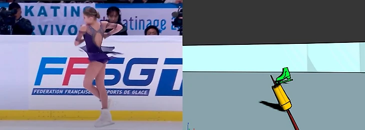 Здесь я построил модель, не особо заморачиваясь за точность и без гифки. Но суть в том, что касания льда, очевидно, нет. А положение конька таково, что для недокрута приблизительно в пол-оборота, касание должно было быть уже здесь. Вместо этого оно происходит в следующем кадре: