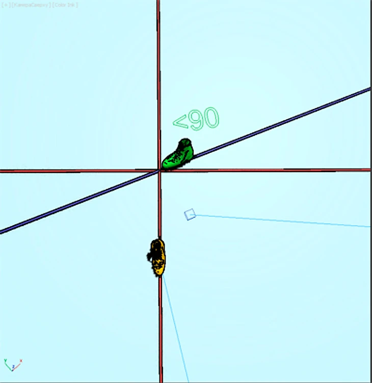 Чтобы зелёный конёк было видно, я поставил его подальше. Конёк развёрнут к камере боком - при таком ракурсе трудно судить об угле поворота, но, кажется, что здесь пятка ближе к камере, чем носок.