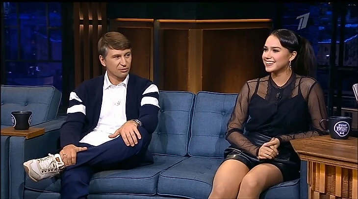 Похоже, Загитова на телевидении уже освоилась. Она и до этого приходила в «Вечерний Ургант», но выглядела скованной и на первый план выходили то Татьяна Навка, то собака Алины – Масару. В этот раз фигуристка была не просто желанным гостем с очаровательной улыбкой и в красивом платье, Алина не стеснялась, шутила и была в центре внимания.
