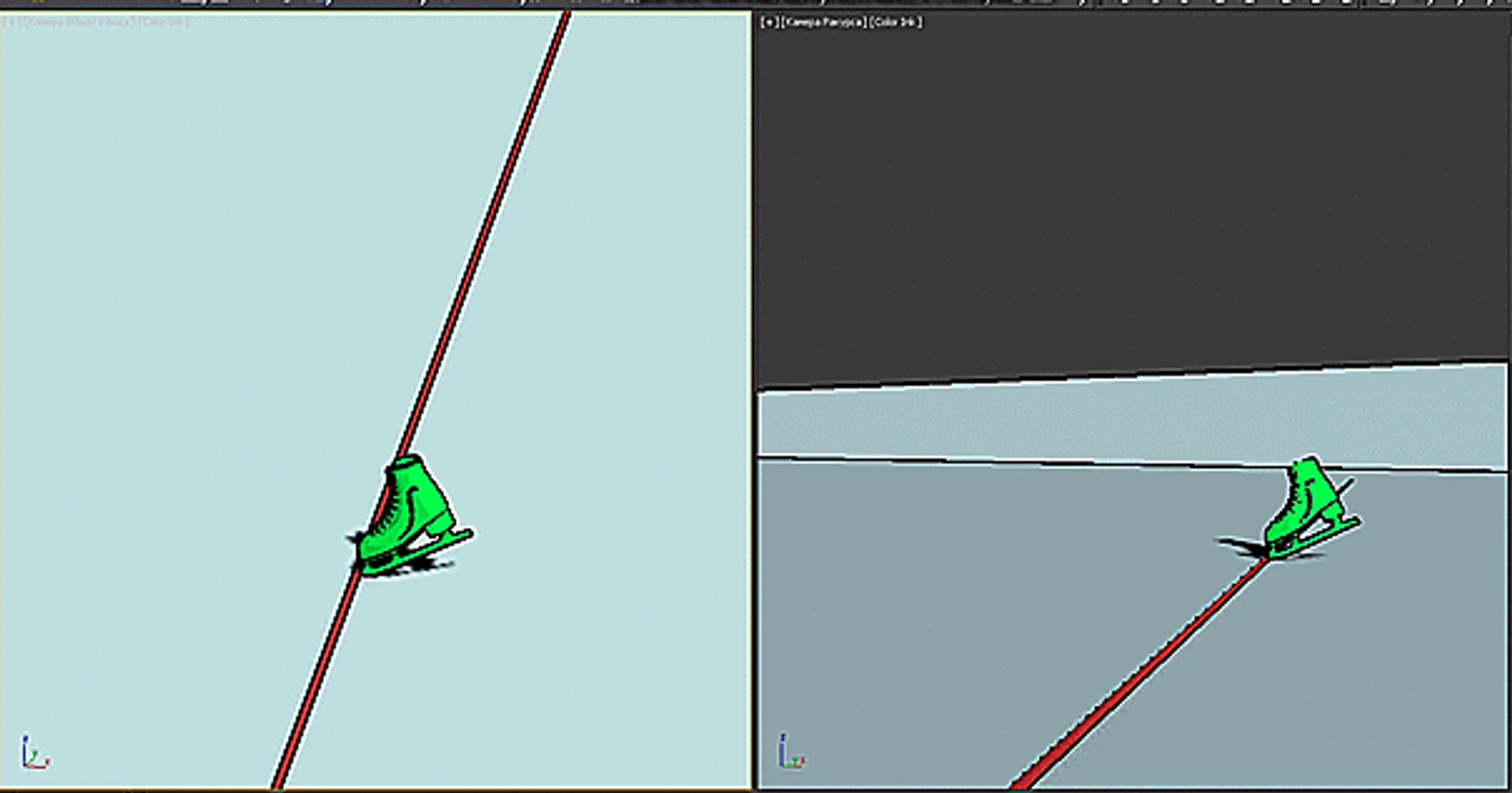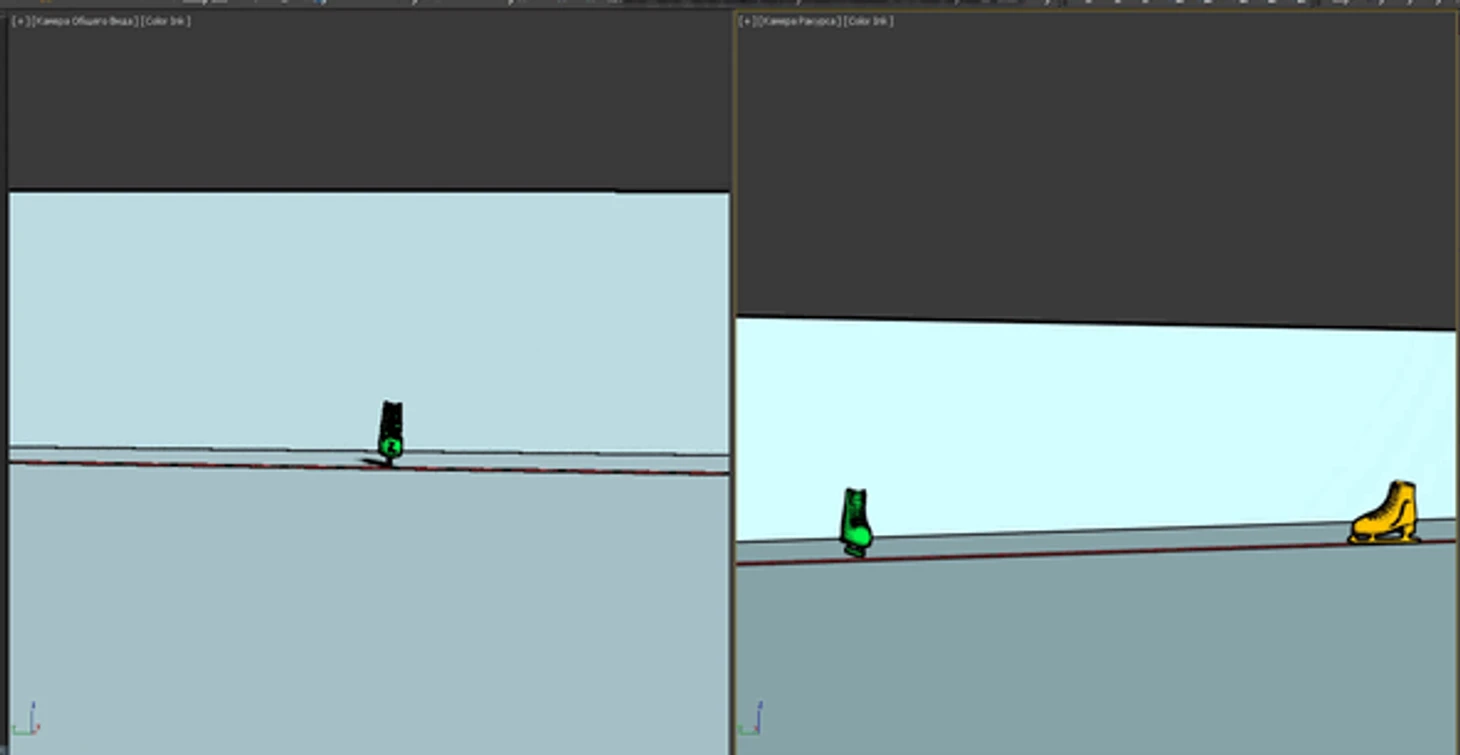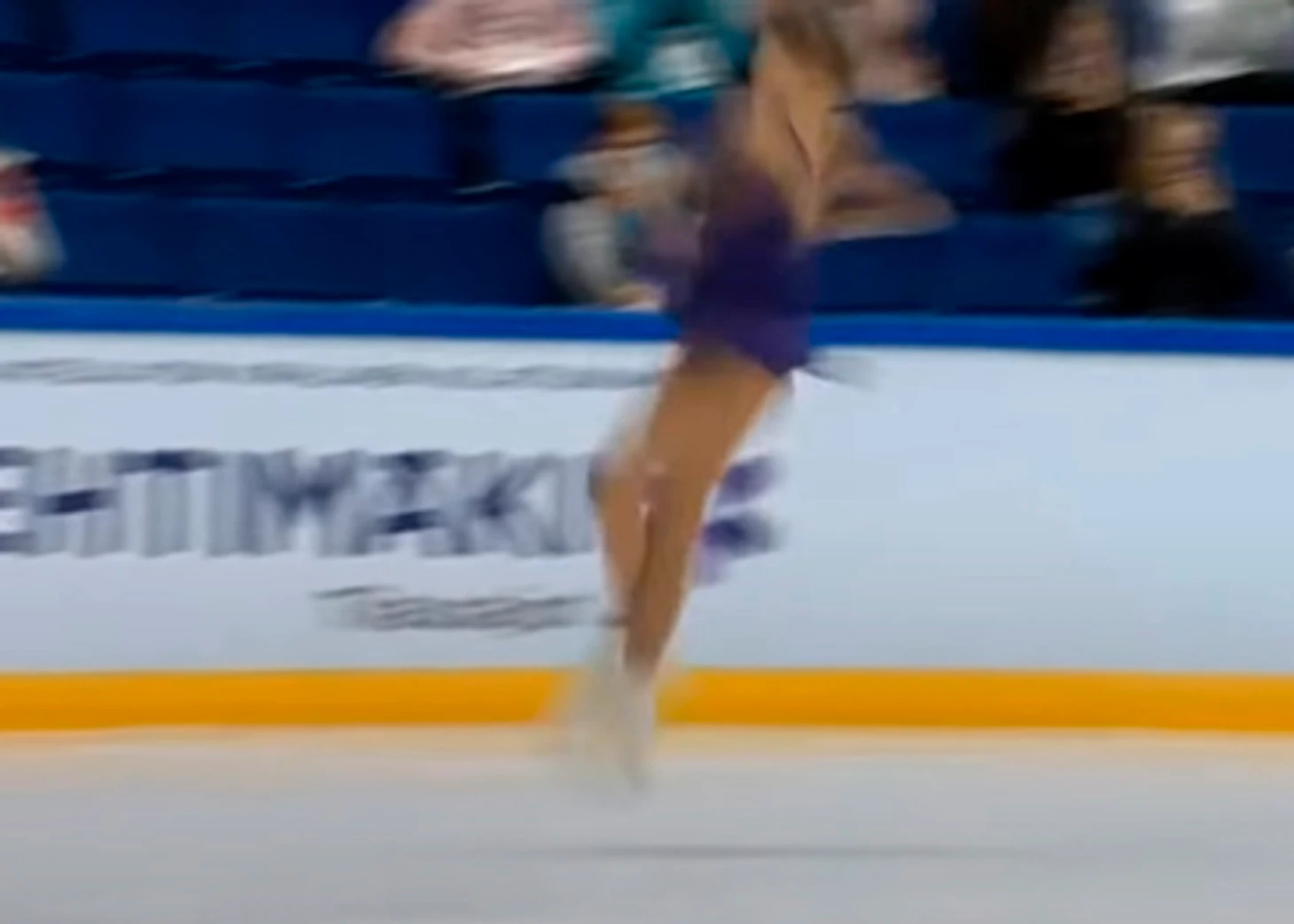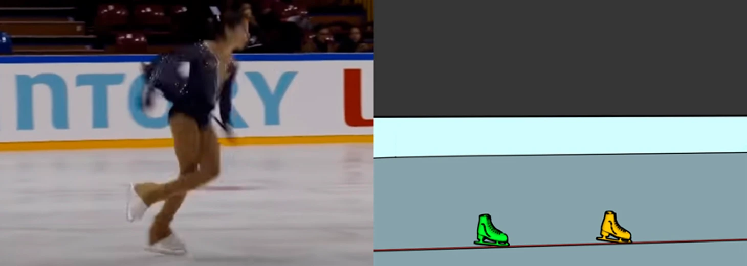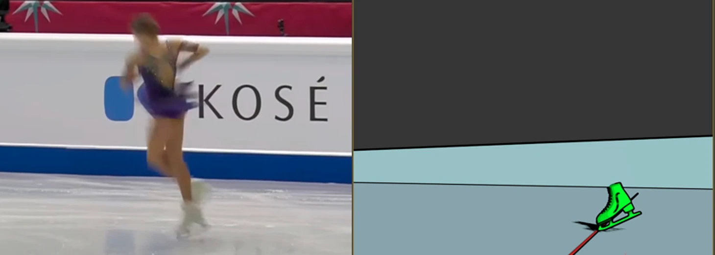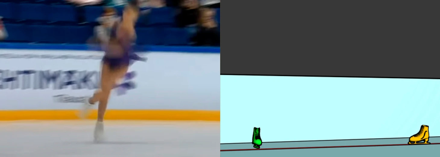 Тоже высоко в воздухе - на касание льда нет и намёка. Только ничегошеньки не разобрать, я даже затрудняюсь построить модель, да и не вижу особого в этом смысла. О положении конька можно догадываться разве что по положению колена.