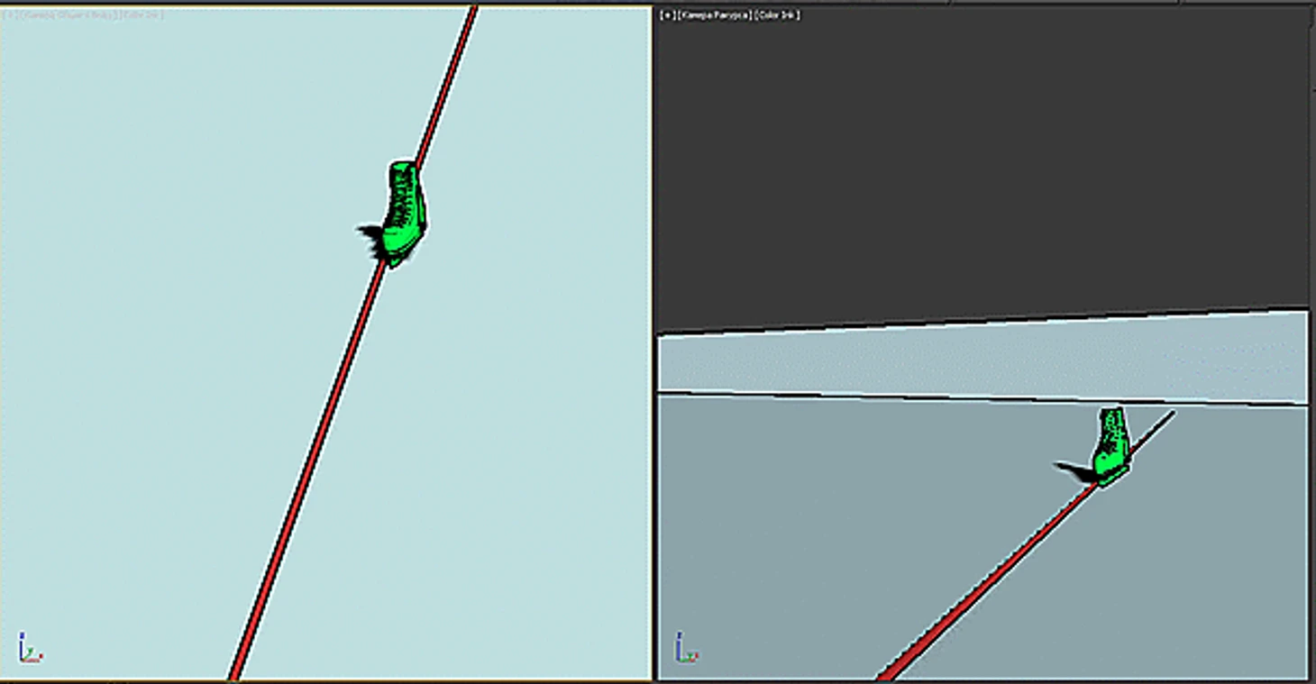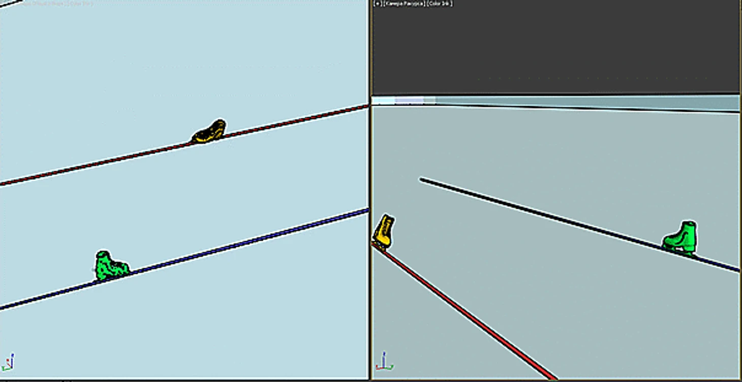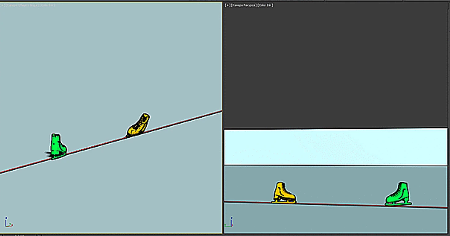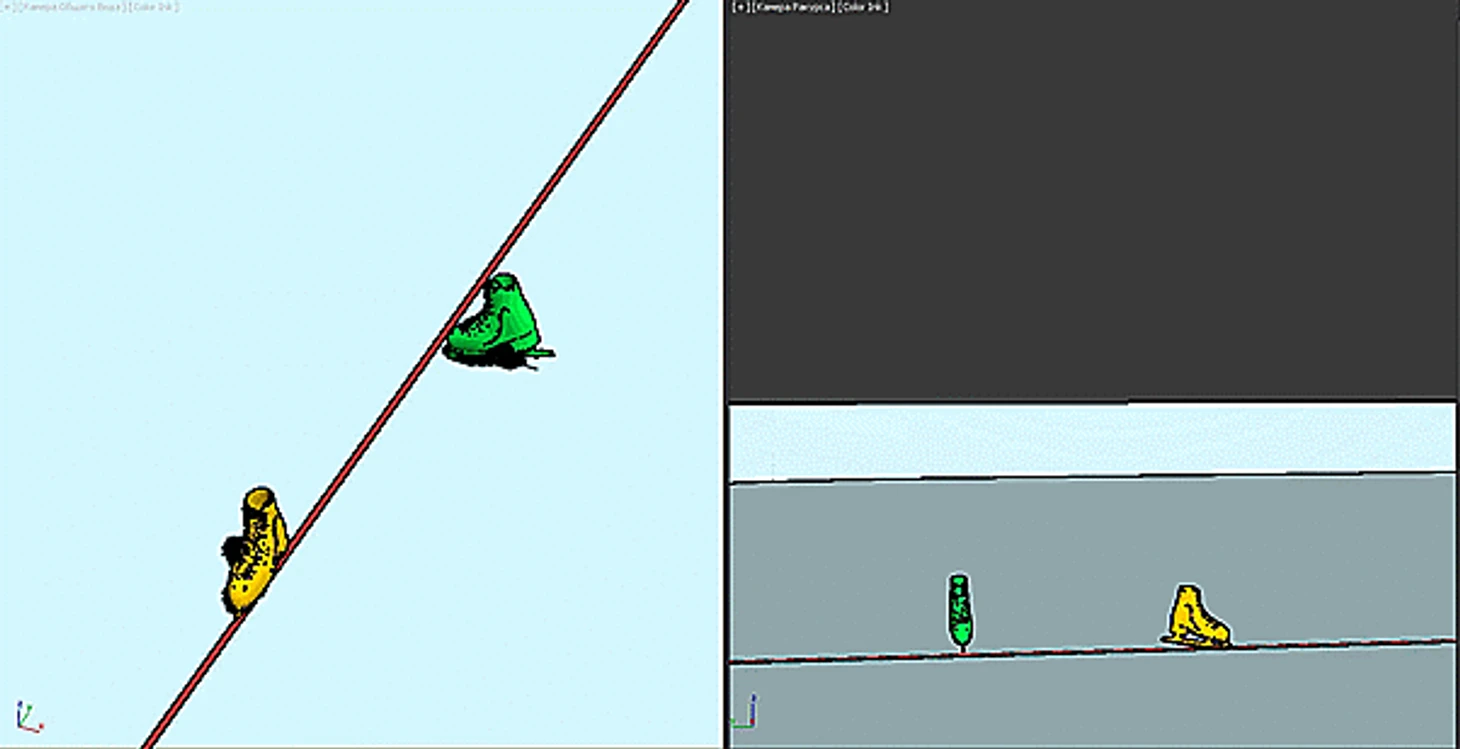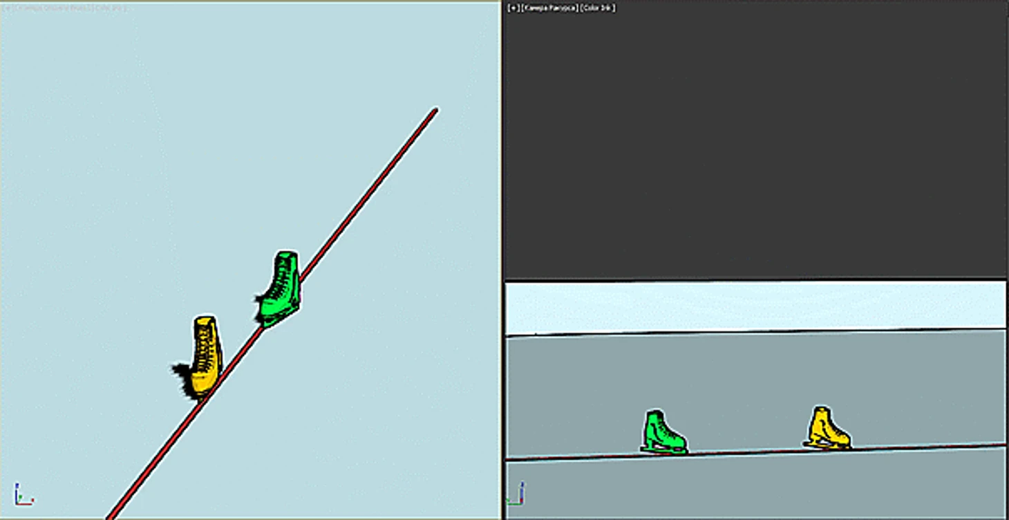 Тоже высоко в воздухе - на касание льда нет и намёка. Только ничегошеньки не разобрать, я даже затрудняюсь построить модель, да и не вижу особого в этом смысла. О положении конька можно догадываться разве что по положению колена.