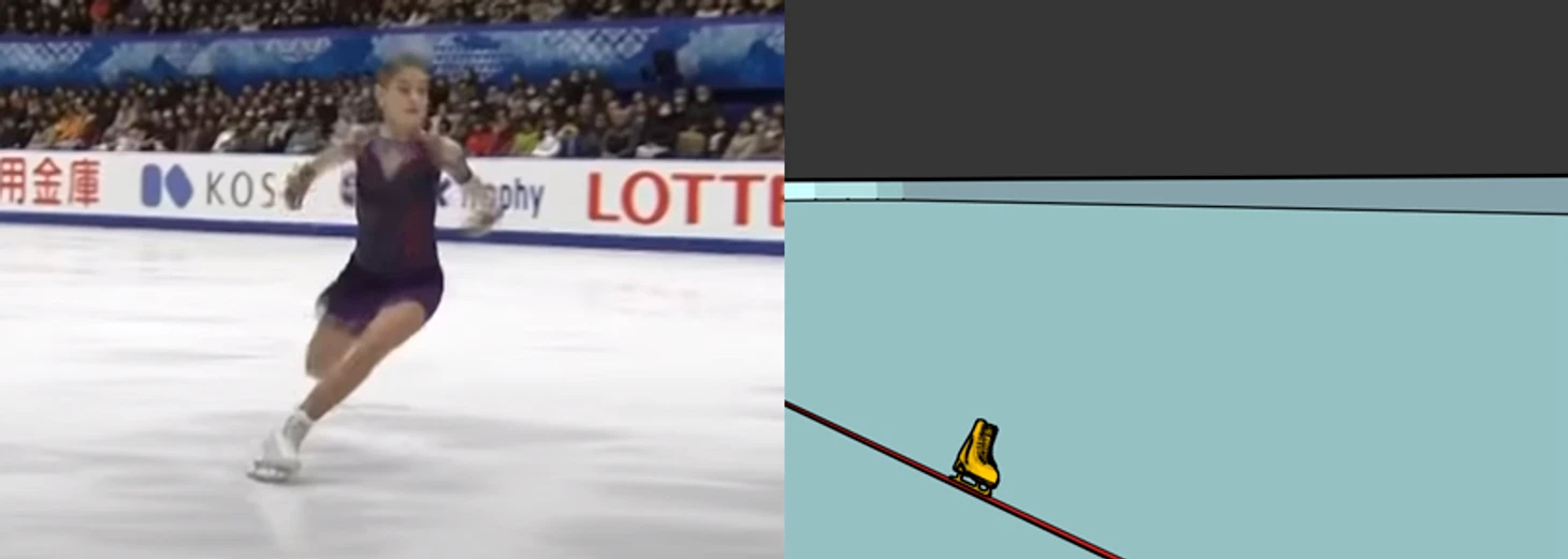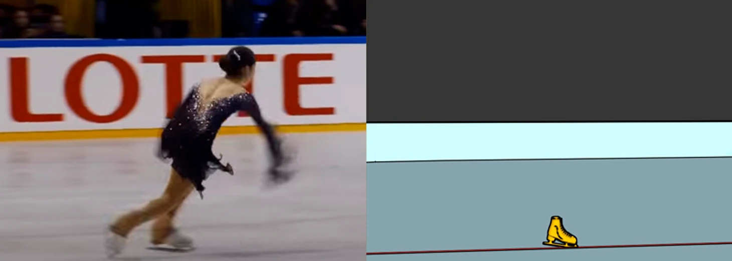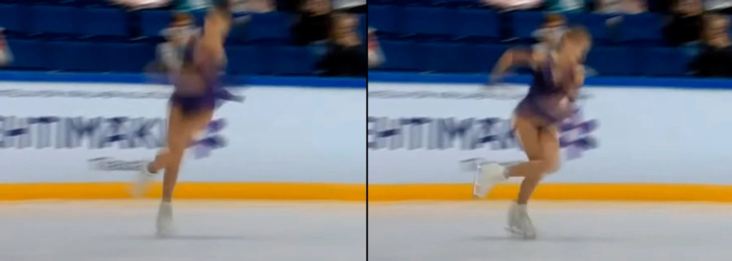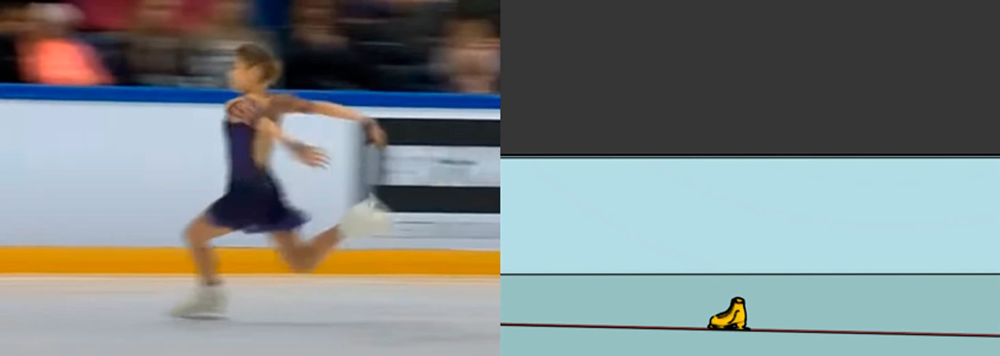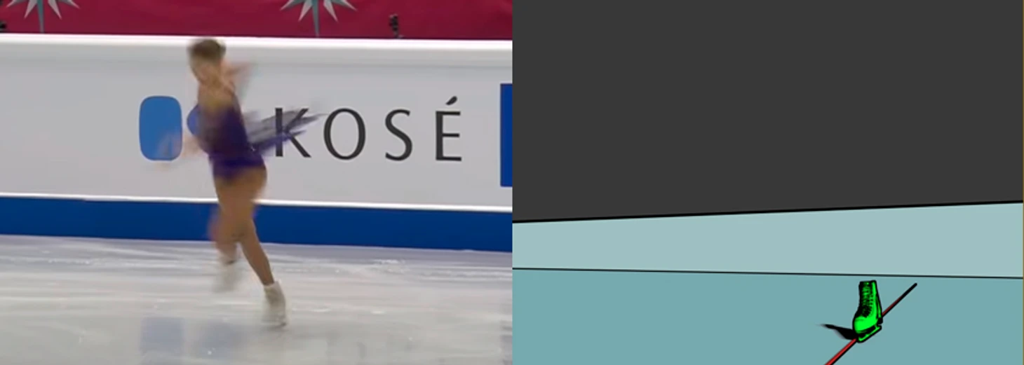 Так как касание льда уже было, скорость частично была погашена, и к следующему кадру Алёна прокрутила совсем небольшой угол.