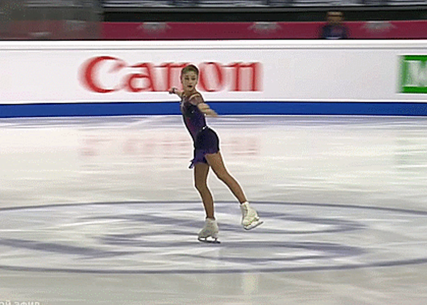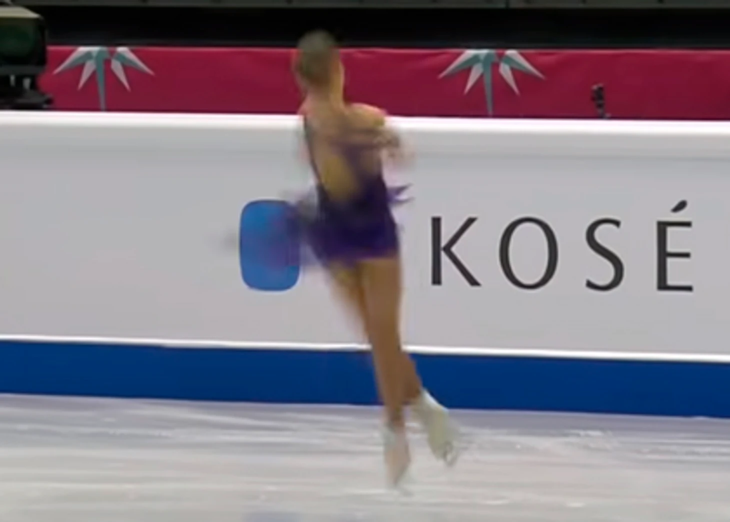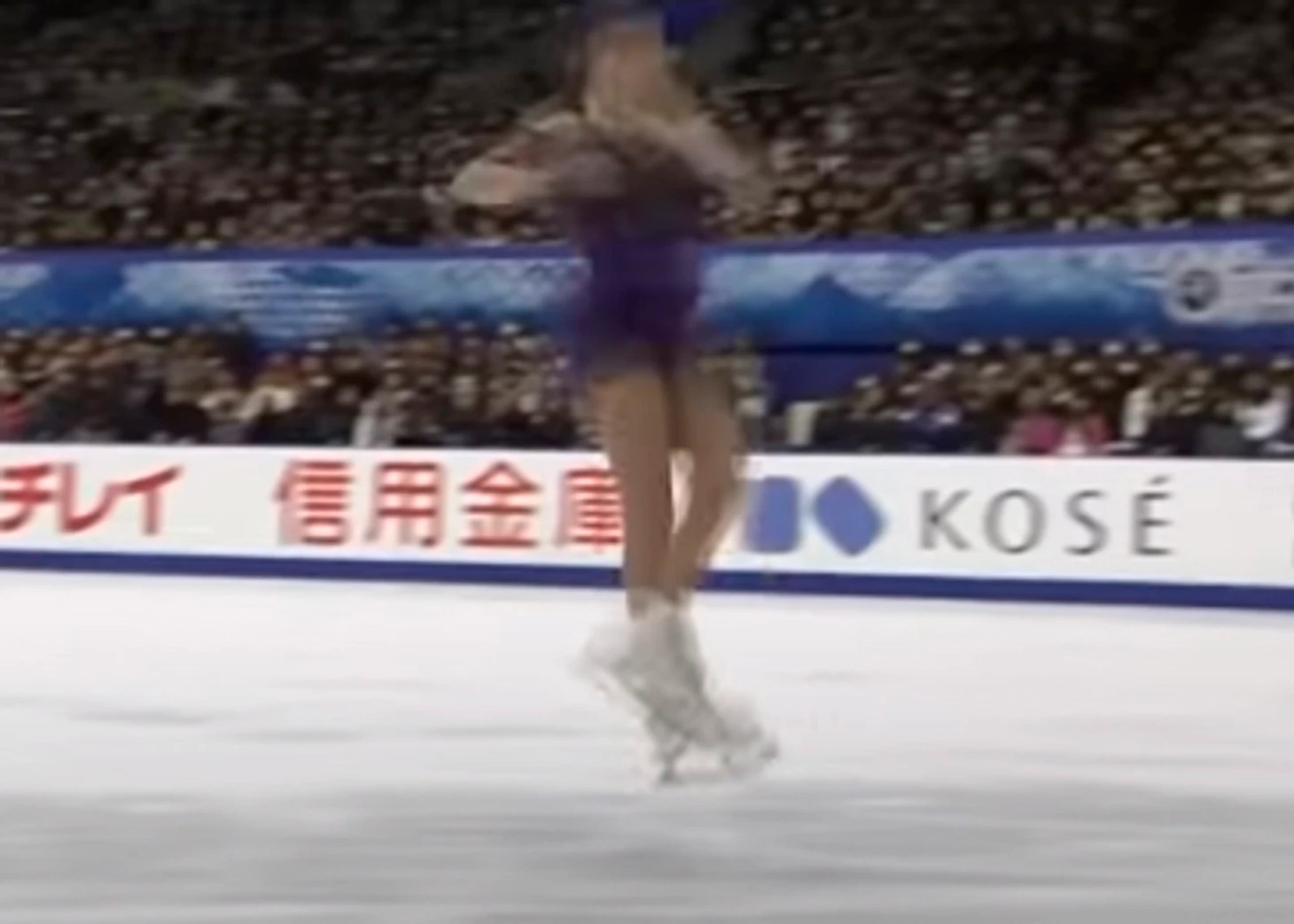 И это уже приземление. Конёк смотрит носком в кадр - но не строго. Видно и заднюю часть лезвия - она находится левее носка. Обычно, при исполнении хорошо докрученного прыжка, Алёна или едва касается льда зубцом, без опоры, или же находится очень близко ко льду. Но в данном случае это именно приземление, опора на лёд есть и это видно не только по этому кадру, но и по следующему: