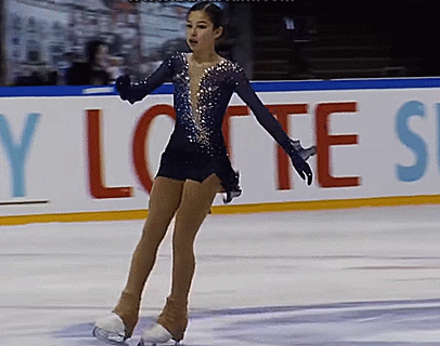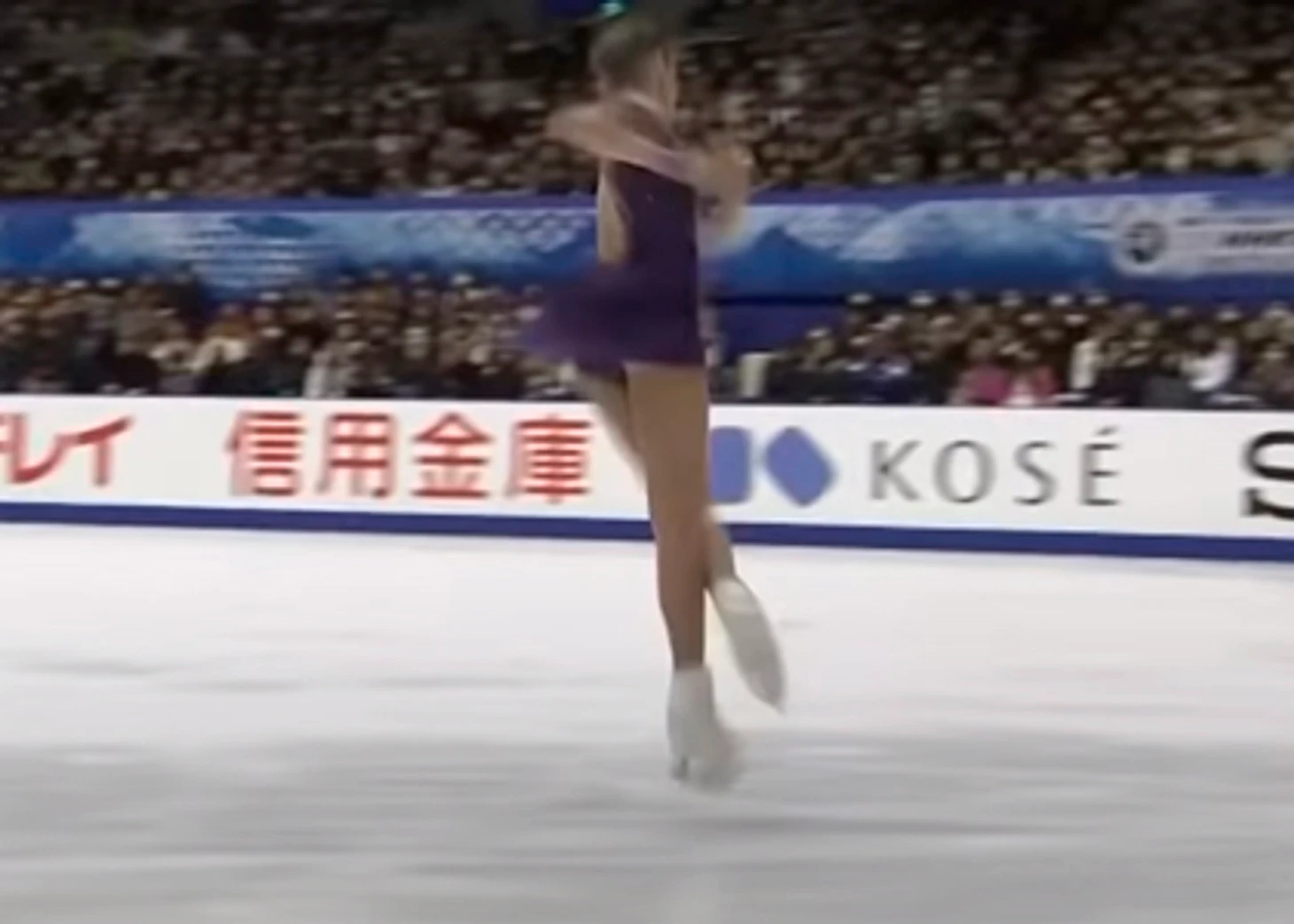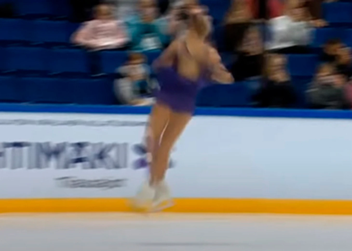 И это уже приземление. Конёк смотрит носком в кадр - но не строго. Видно и заднюю часть лезвия - она находится левее носка. Обычно, при исполнении хорошо докрученного прыжка, Алёна или едва касается льда зубцом, без опоры, или же находится очень близко ко льду. Но в данном случае это именно приземление, опора на лёд есть и это видно не только по этому кадру, но и по следующему: