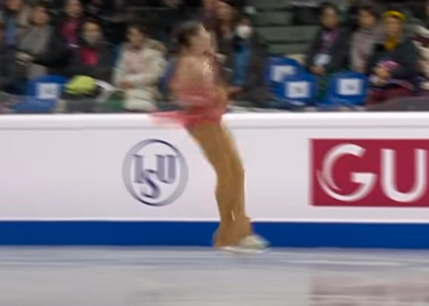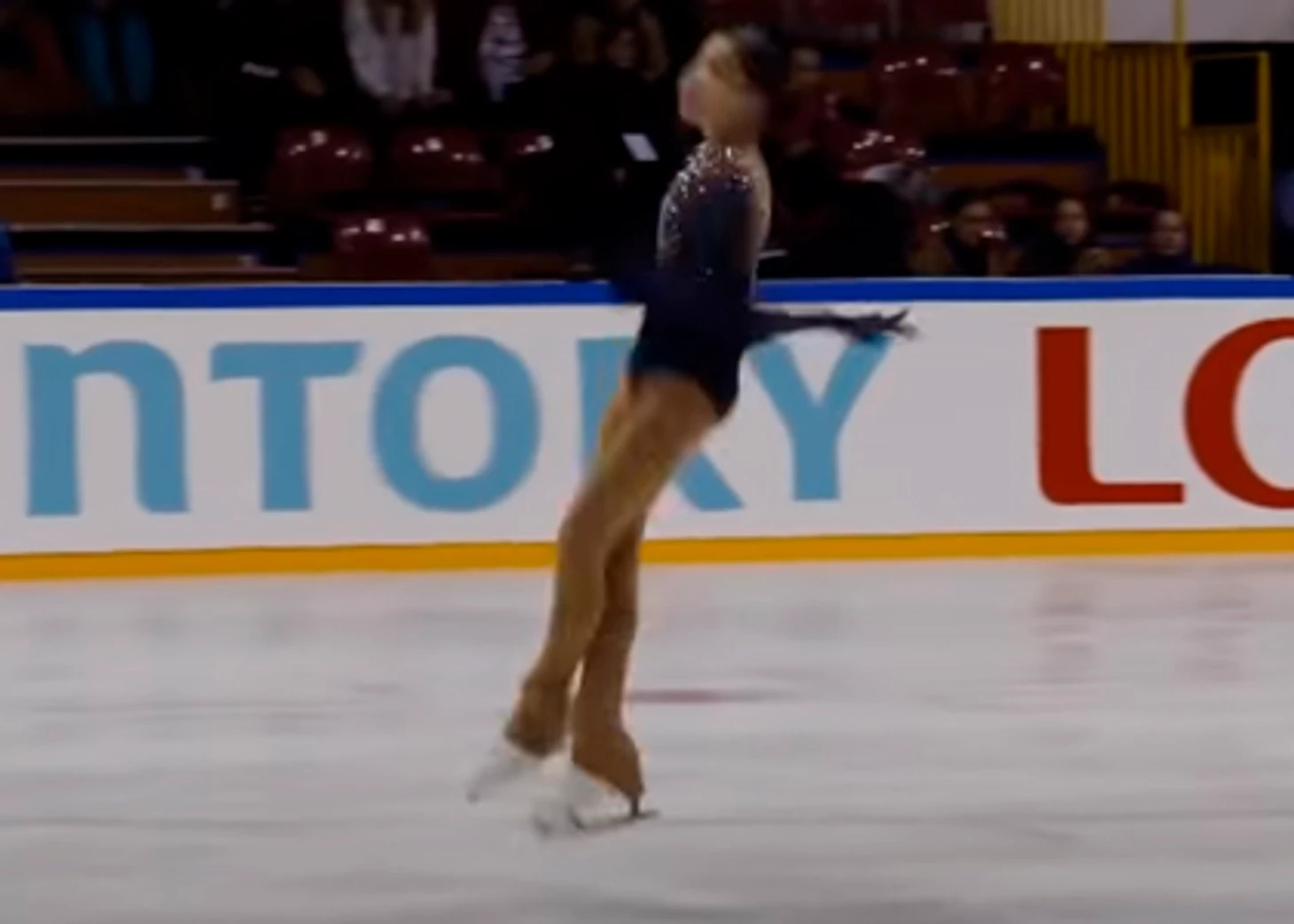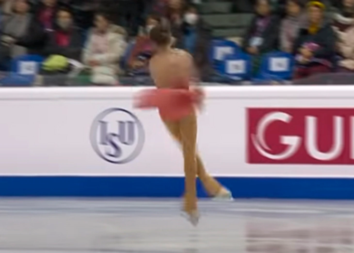 Как видим, прыжок докручен хорошо, "галки" здесь и нет. И её и не поставили. В чём причина снижения ГОЕ - сказать трудно, но явно не в докруте. Возможно, не было хорошего пролёта.
