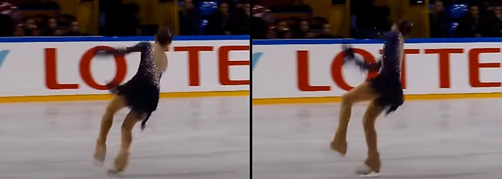 Следующий 3Л - пусть будет Алёны Косторной. Обозначаю оранжевым цветом. В качестве примера прыжок с короткой программы Чемпионата России.