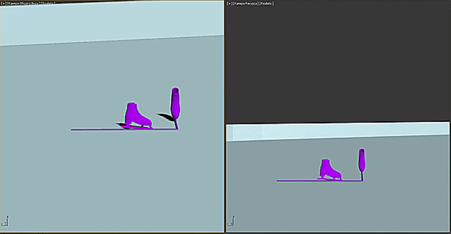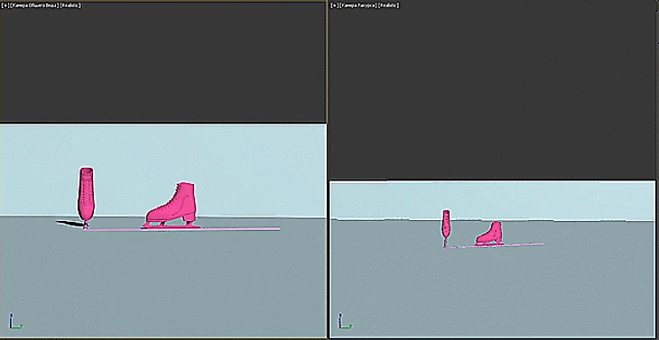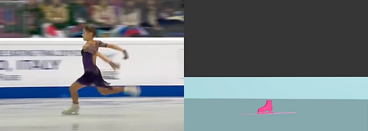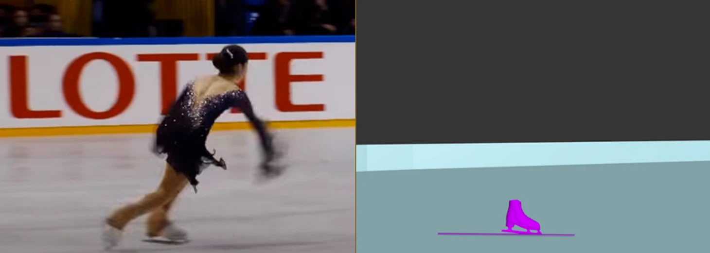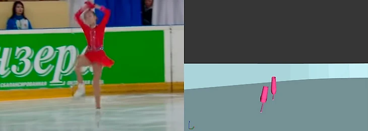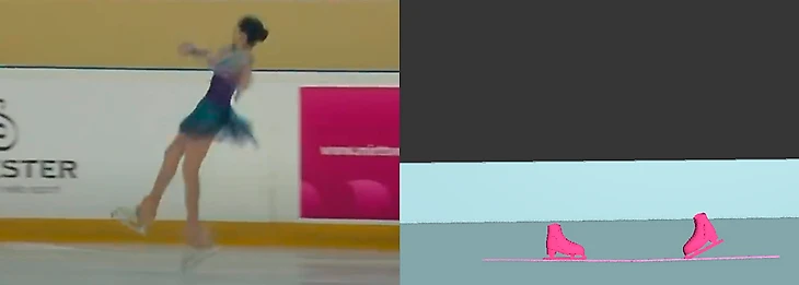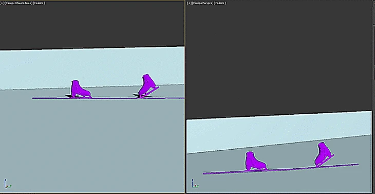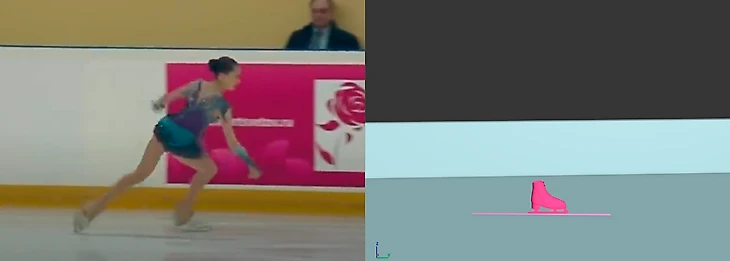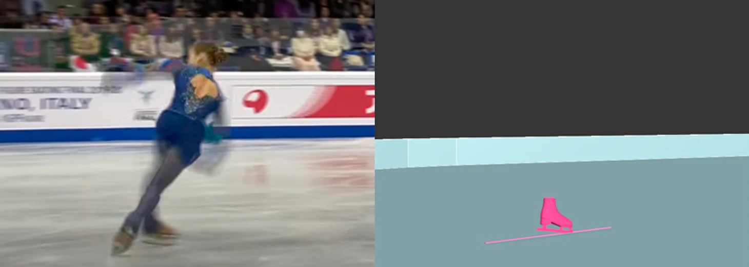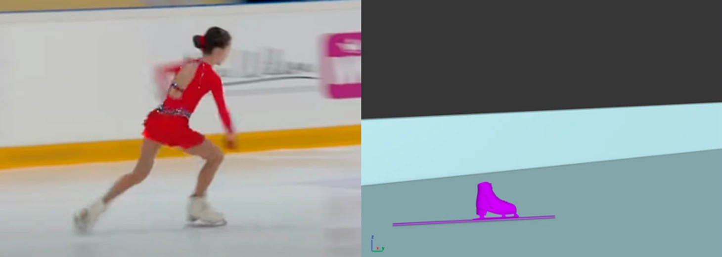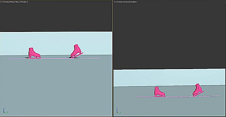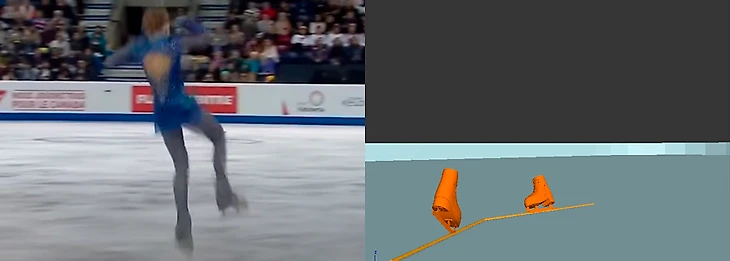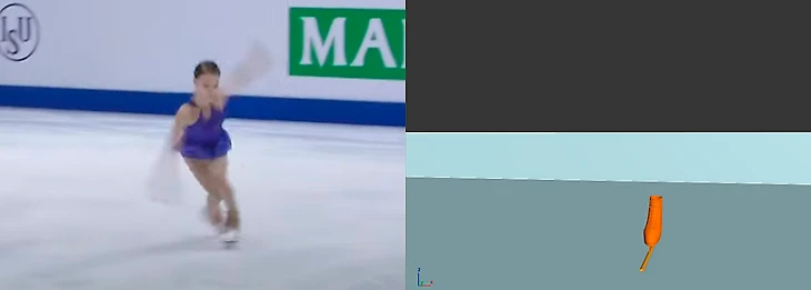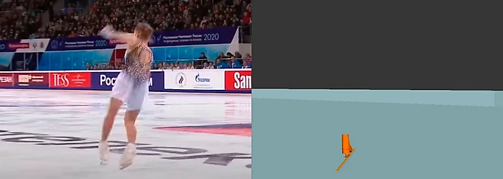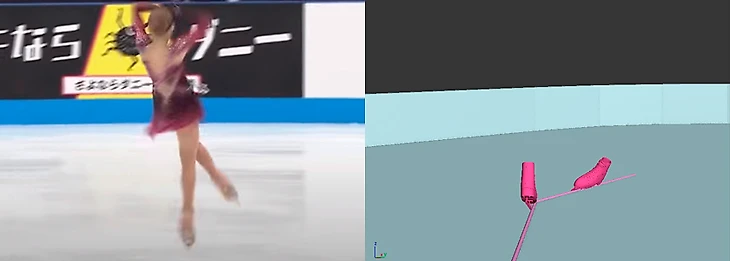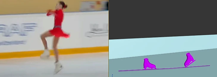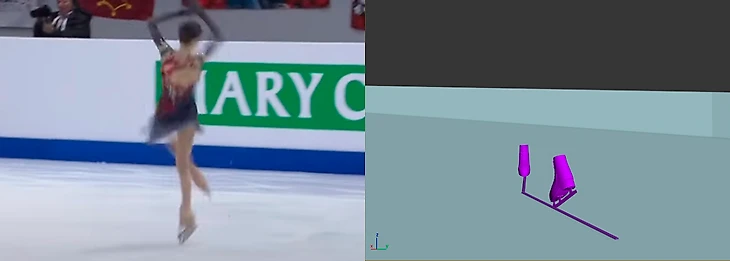 Метод исследования будет тем же, что и для недокрутов - с помощью 3d воссоздания положений конька по скриншотам. Модель будет строиться по двум кадрам - начала и отрыва. Два кадра - два положения, которые я расставлю на льду таким образом, чтобы удобнее было оценить угол. В отличие от недокрутов, с преротами всё будет проще, без дополнительных достроений, если не считать таковыми линии, проходящие через лезвия коньков, чтобы удобнее было оценивать угол.
