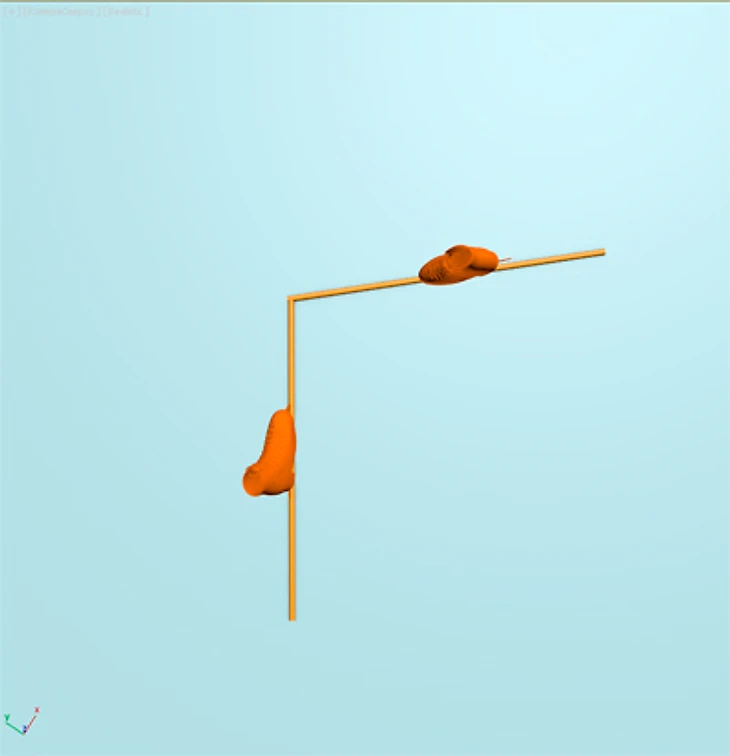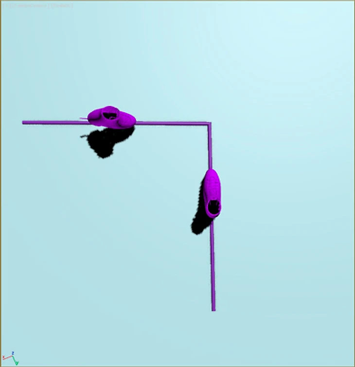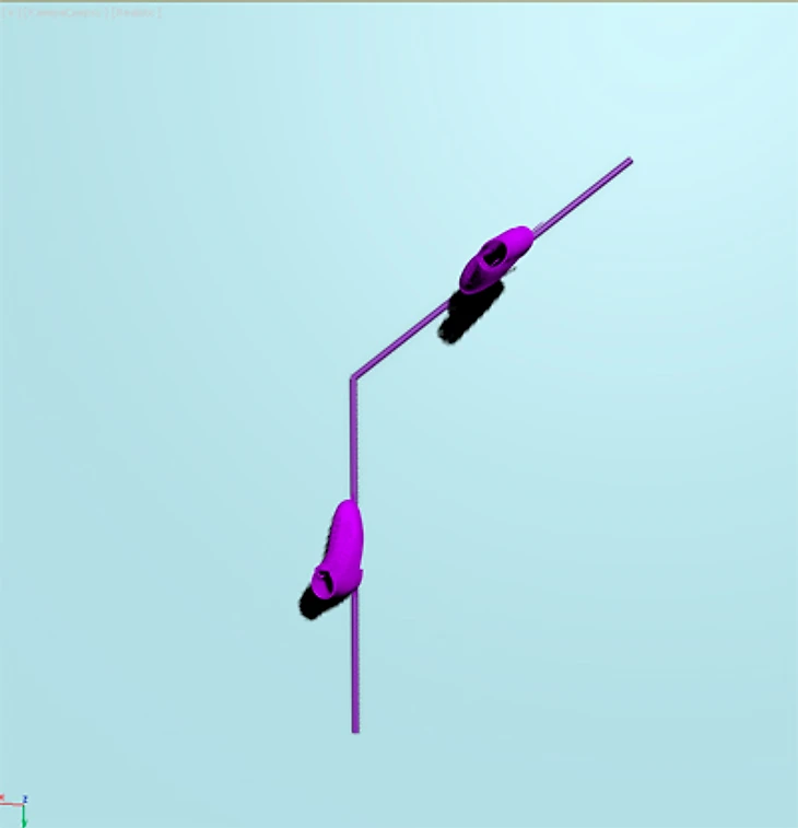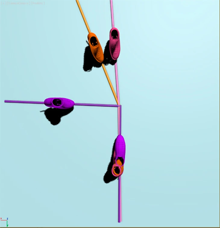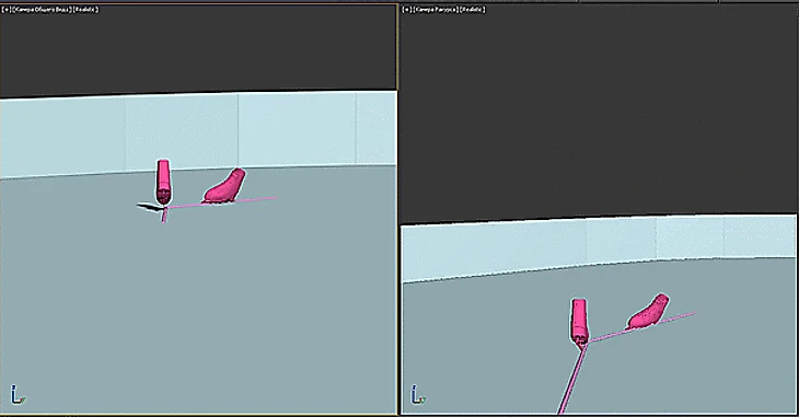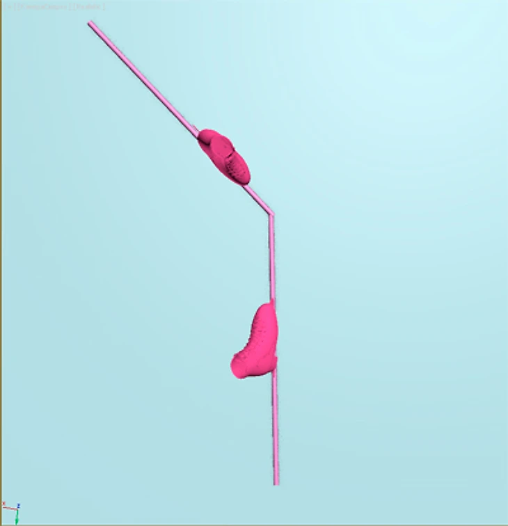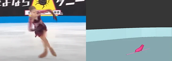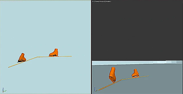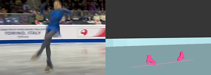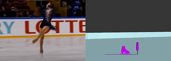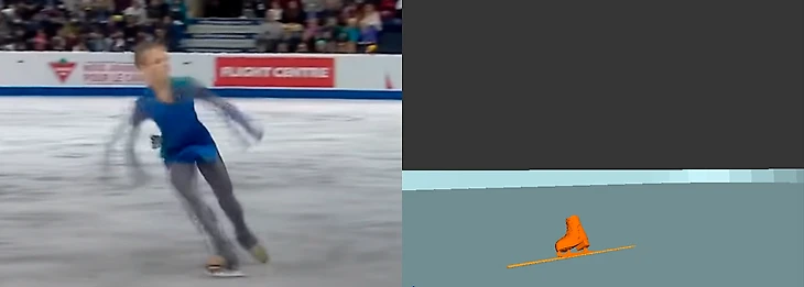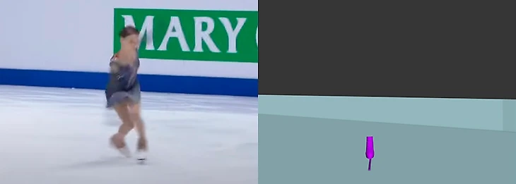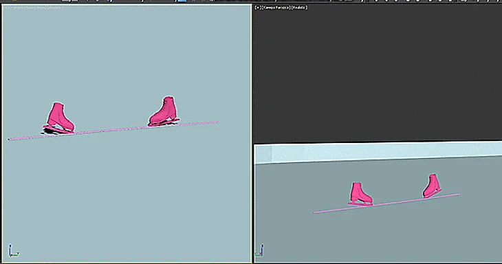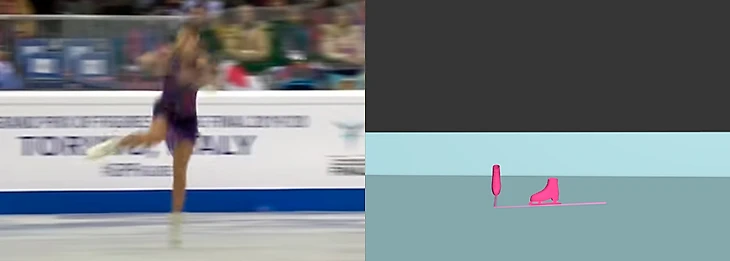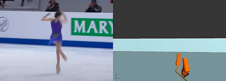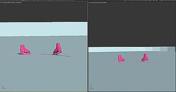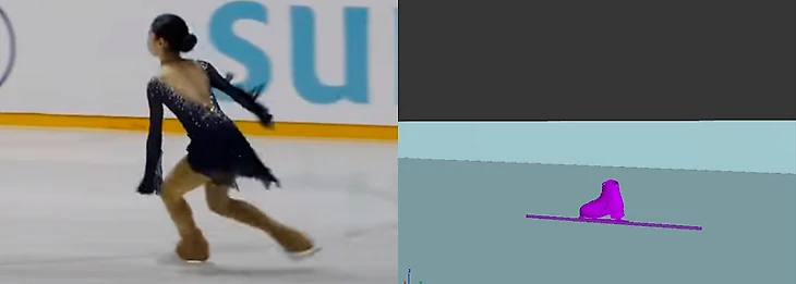 Метод исследования будет тем же, что и для недокрутов - с помощью 3d воссоздания положений конька по скриншотам. Модель будет строиться по двум кадрам - начала и отрыва. Два кадра - два положения, которые я расставлю на льду таким образом, чтобы удобнее было оценить угол. В отличие от недокрутов, с преротами всё будет проще, без дополнительных достроений, если не считать таковыми линии, проходящие через лезвия коньков, чтобы удобнее было оценивать угол.