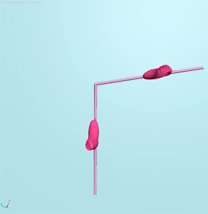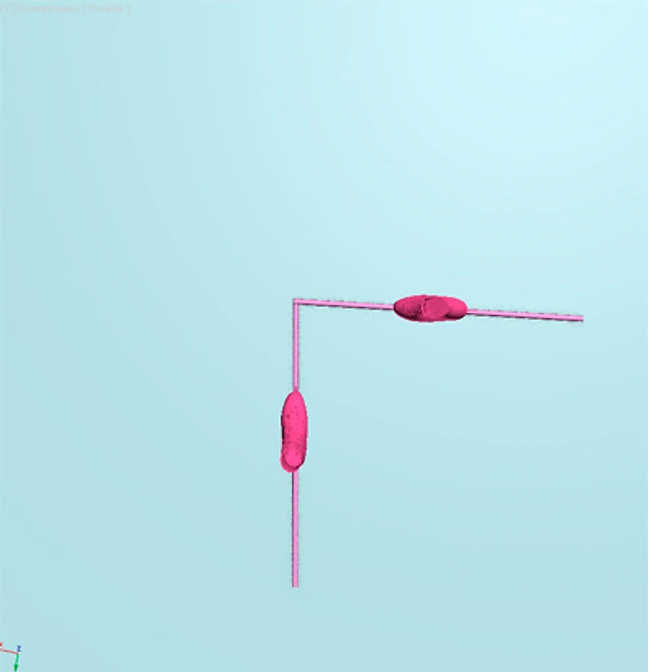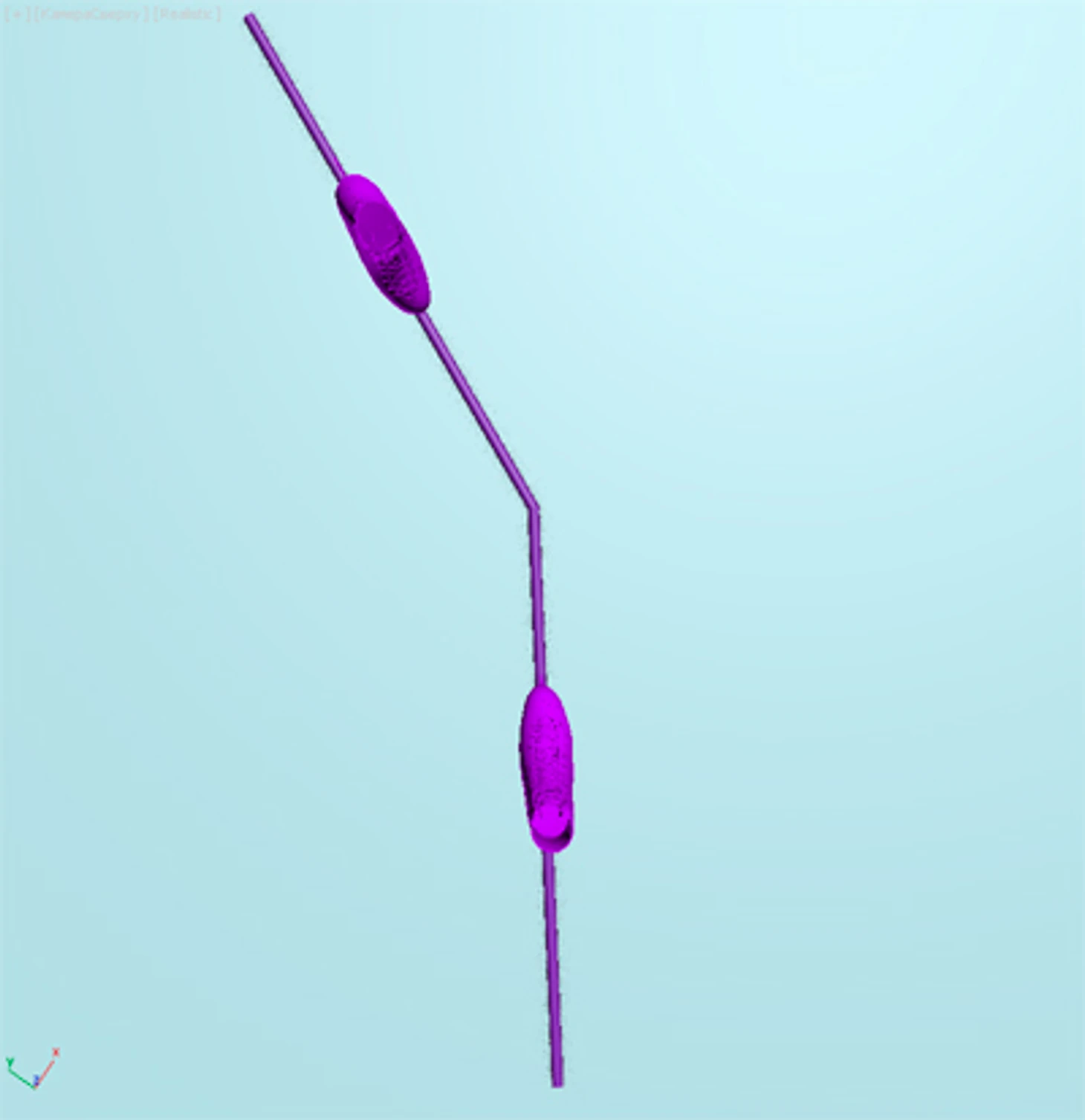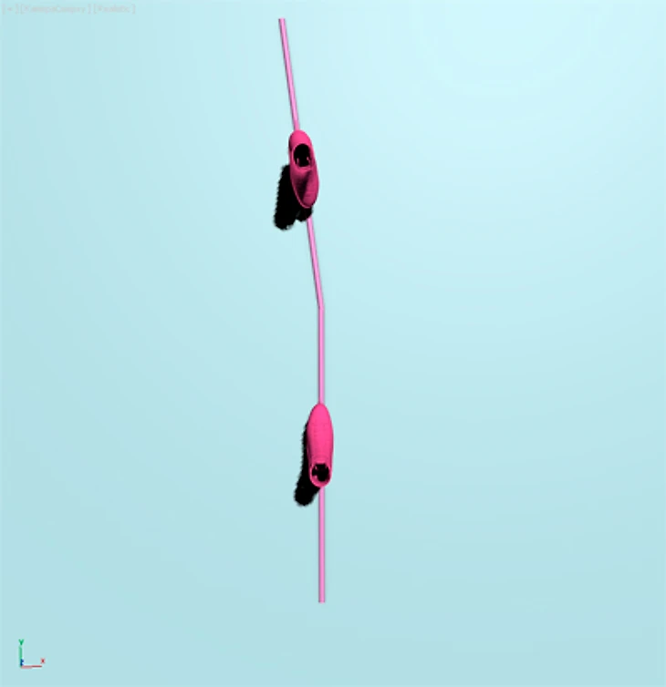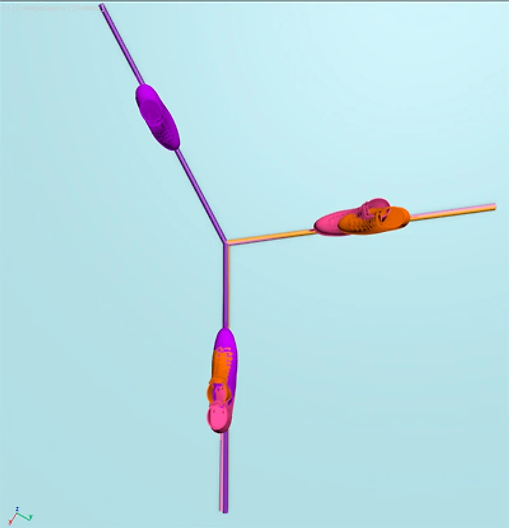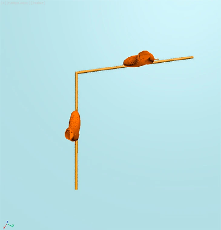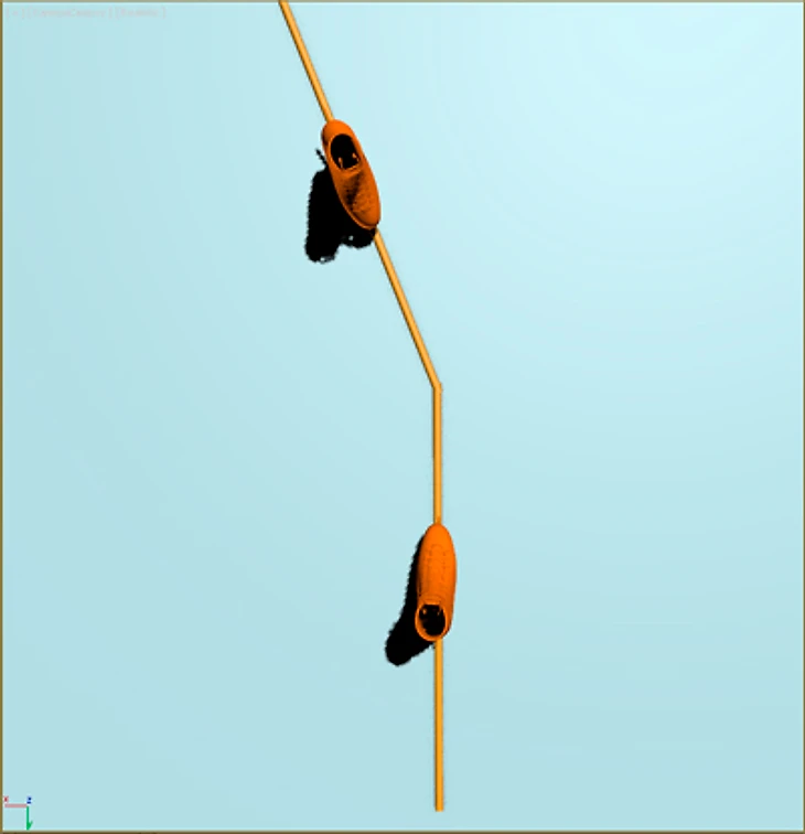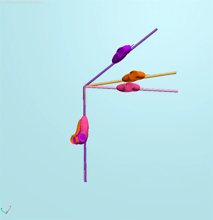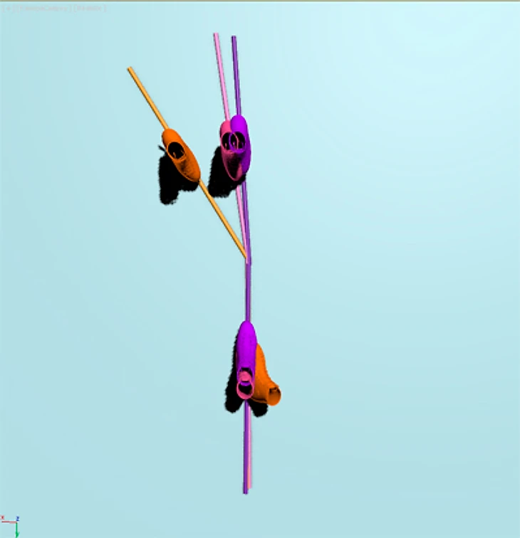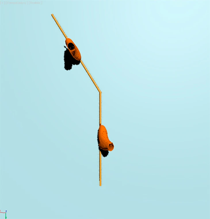 Метод исследования будет тем же, что и для недокрутов - с помощью 3d воссоздания положений конька по скриншотам. Модель будет строиться по двум кадрам - начала и отрыва. Два кадра - два положения, которые я расставлю на льду таким образом, чтобы удобнее было оценить угол. В отличие от недокрутов, с преротами всё будет проще, без дополнительных достроений, если не считать таковыми линии, проходящие через лезвия коньков, чтобы удобнее было оценивать угол.