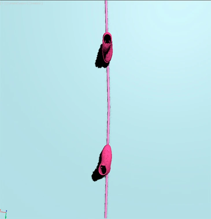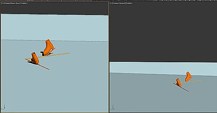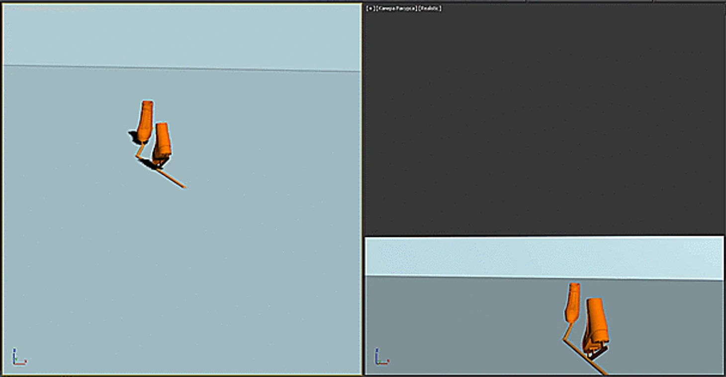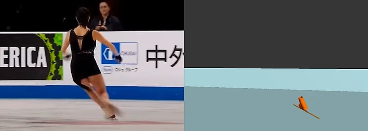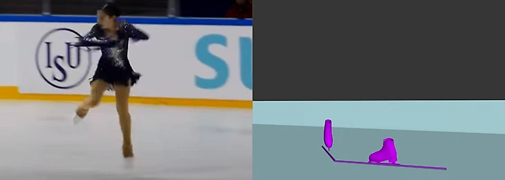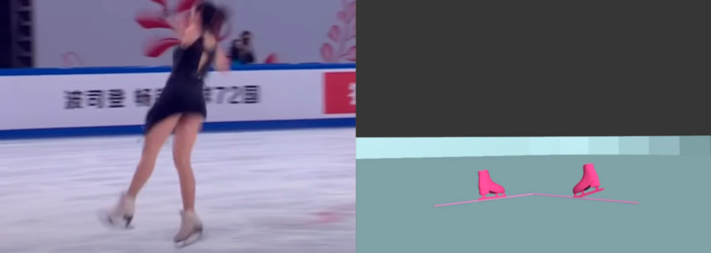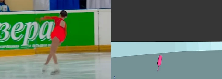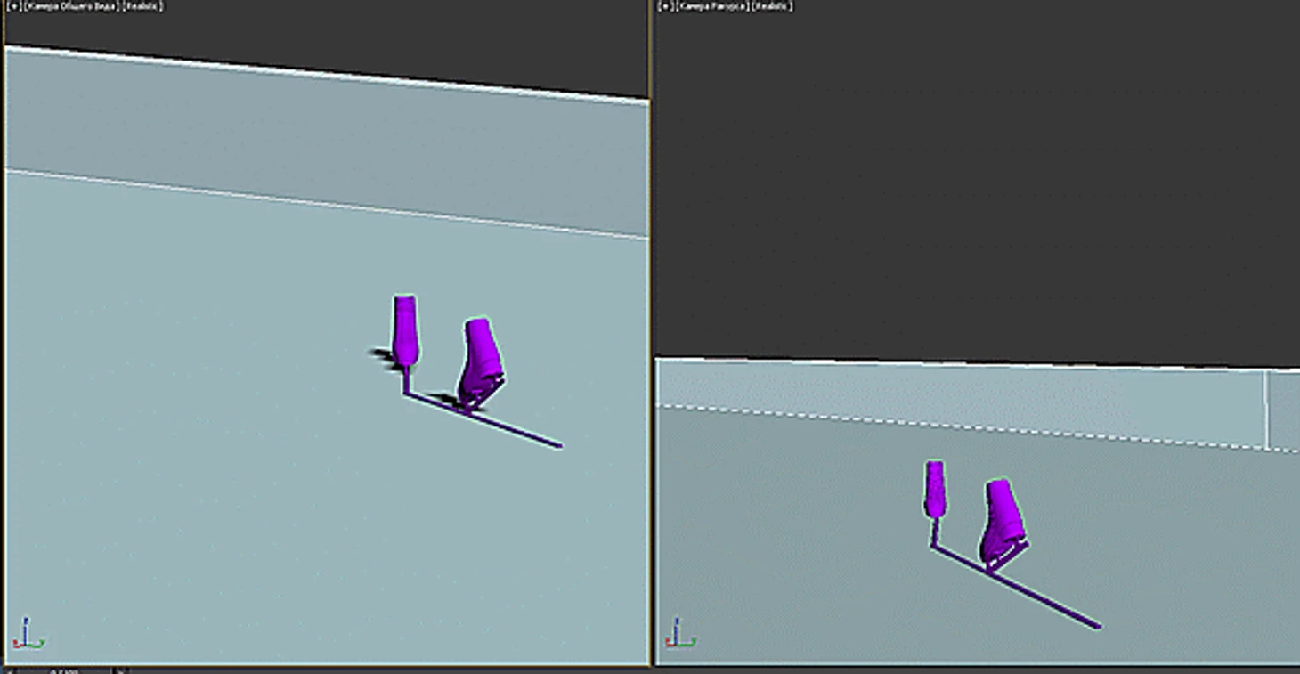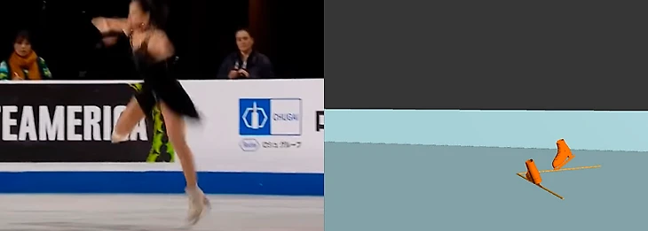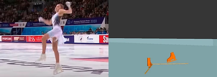 Для наглядности модель конька в положении отрыва располагается вместе с моделью в положении толчка. Главное - угол, а конкретная позиция на льду не важна, поэтому модели располагаются носками друг к другу - так удобнее оценить вращение, которое, напомню, происходит против часовой срелки. Теперь рассмотрим результат подробнее: