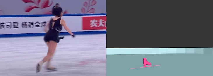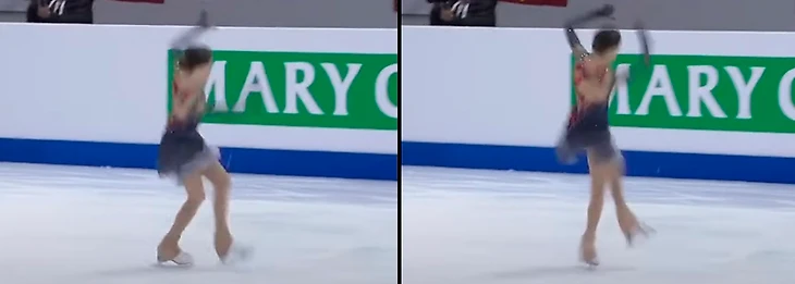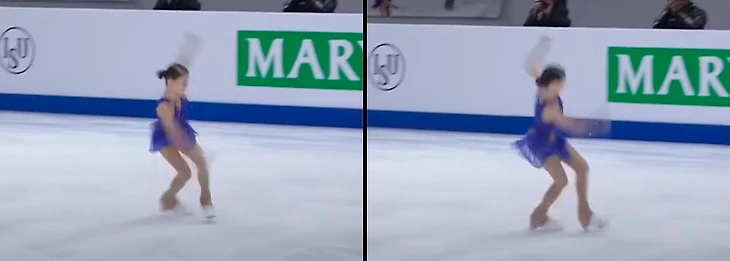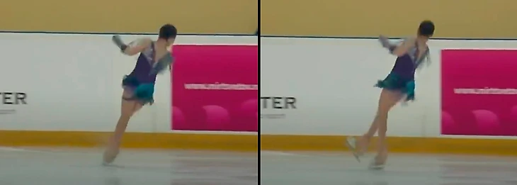 Сравним с Алисой Лю. Которая считается нетехничной фигуристкой. Триксель с КП ФЮГП всё-таки довольно размыт в моменте отрыва, поэтому возьму сольнык с ПП на этапе в Польше. Это, кстати, тоже была хорошая её попытка. Цвет будет фиолетовым.