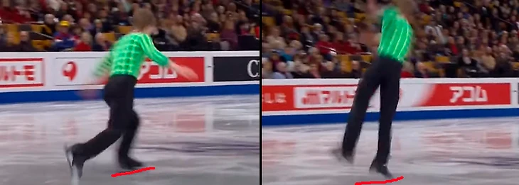 На картинке слева - толчок зубцом, справа - отрыв. Красным подчёркнуто положение "нужных" коньков. Михаил отрывается ото льда так быстро (4 кадра или 0,133 секунды), что успевает прокрутиться лишь на очень небольшой угол. И то - только корпусом, в то время как конёк чуть отстаёт, и поэтому можно считать такой прерот нулевым. У девушек я такой уникальной техники отыскать не смог. Поэтому это - некоторый частный случай, который выбивается из общей системы. В целом же, прокручивать часть вращения на льду даже на лутце - норма. Если эта часть невелика.