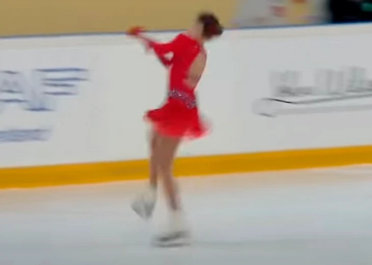 И в качестве последнего примера для 4Т я возьму Александру Трусову. Попытка со Скейт Канады. В каскаде с ойлером. Оранжевый цвет.