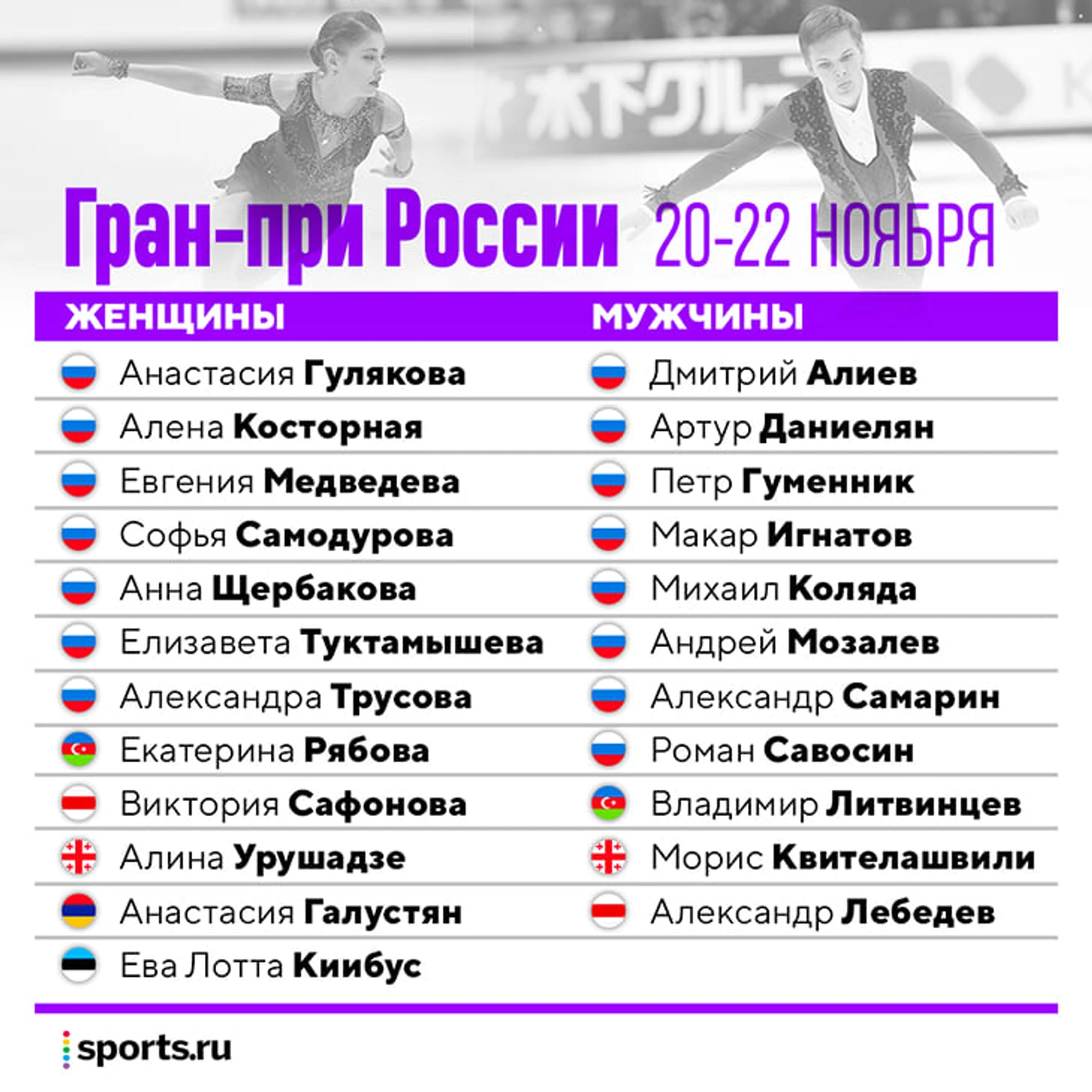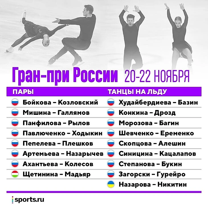 С российскими участниками все очевидно – выступит сборная России в максимально возможном составе. Не хватает разве что пары Евгении Тарасовой и Владимира Морозова – они подали заявку на этап Гран-при в США (тренировались в Америке), но пропустили турнир из-за коронавируса у партнера.