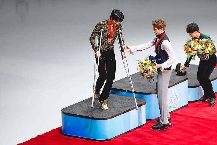 - Спорт - дело травмоопасное. Юдзуру Ханю на тренировке перед произвольной программой московского этапа Гран-при 2018 травмировал лодыжку, но решил продолжить борьбу и закончил соревнования на первом месте.