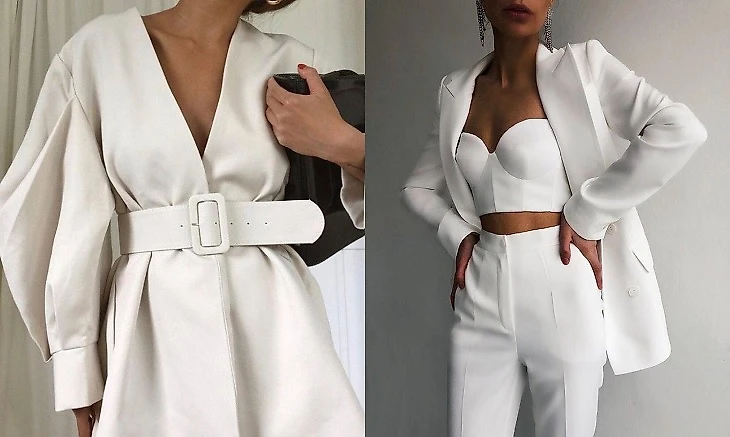 Также можно костюм из топа и брюк, которые подчеркнут потрясающую талию, красивые бедра, но не будут открывать верх: будет открыто декольте, а плечи закроем пиджаком.