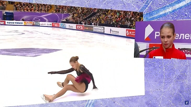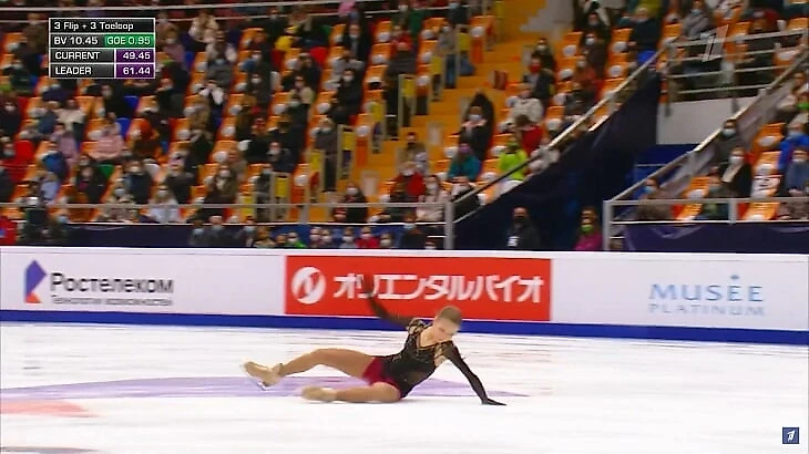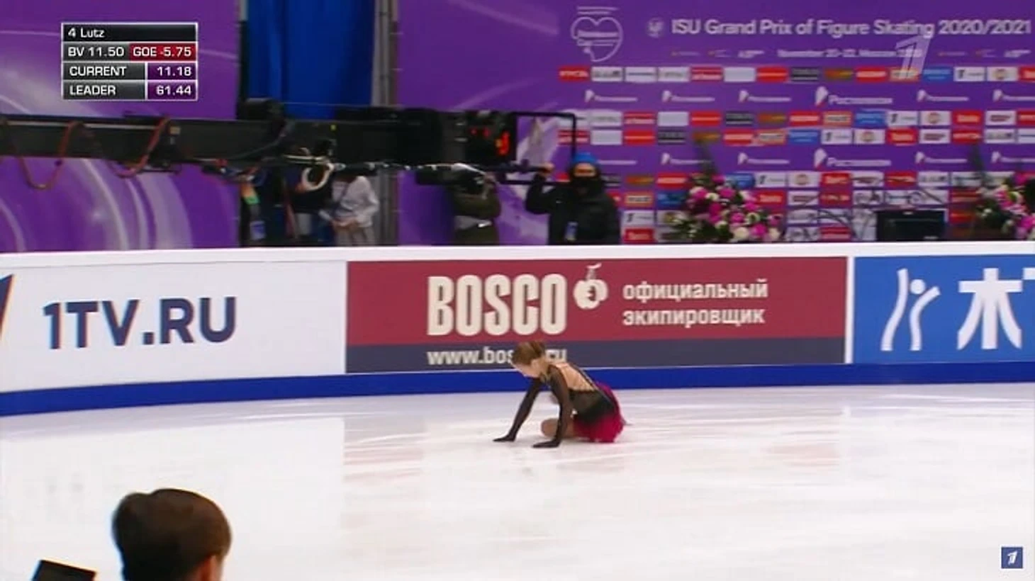 Проблемы на этом не кончились: на каскаде из тройных флипа и тулупа снова вылез недокрут. А на сольном тройном лутце Саша уже просто рухнула на лед. И это в программе еще не нашлось места каскаду лутц – риттбергер, на котором Трусовой и без того постоянно ошибалась.