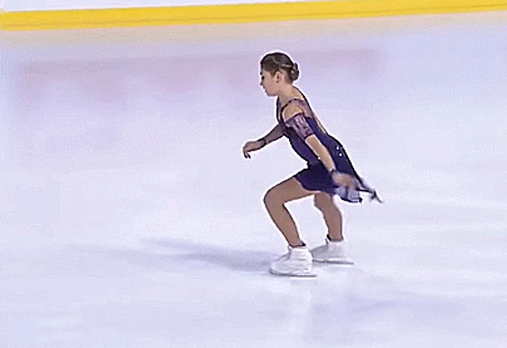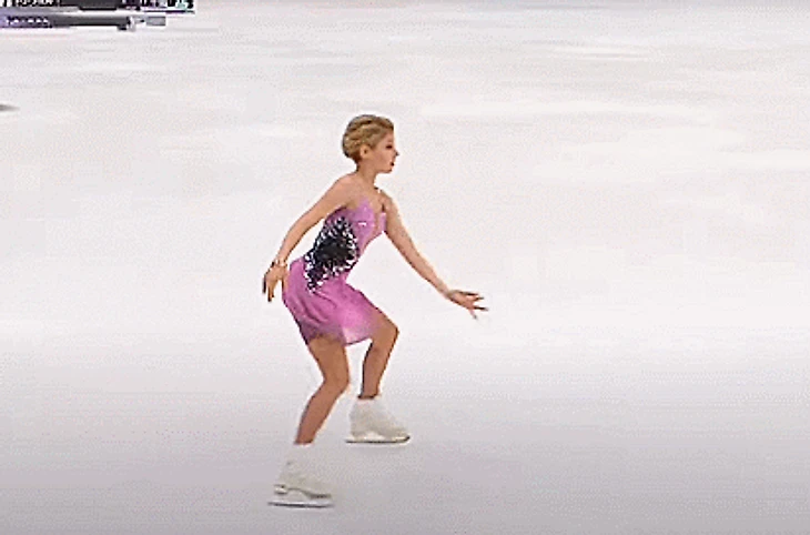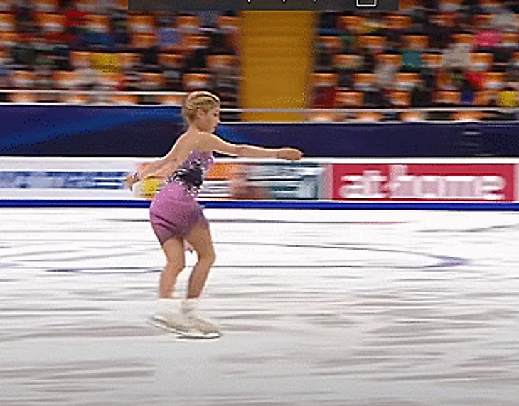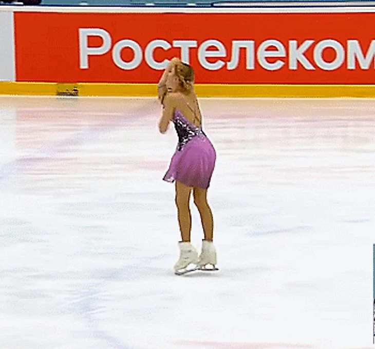В плане захода на флип-тулуп никаких изысков, кроме привычных для Алёны шагов, с которых она делает флип, нет. Они следуют сразу после набора скорости.