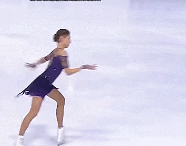 Это набор скорости плюс заход на второй квад. К моменту выезда с него проходит 46 секунд от начала проката - и Камила тоже мало чего интересного по связкам успевает показать за это время. Готовясь к 4Т, фигуристка как бы выключается из программы, не показывая ещё и хорео.