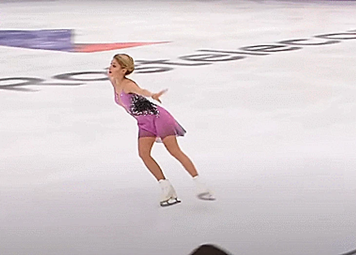 Начало программы Бурн выглядит пустым. После 8 секунд на двух ногах плюс кораблика следует набор скорости, потом дупель с бауера. Затем довольно простой заход на лутц после набора скорости: